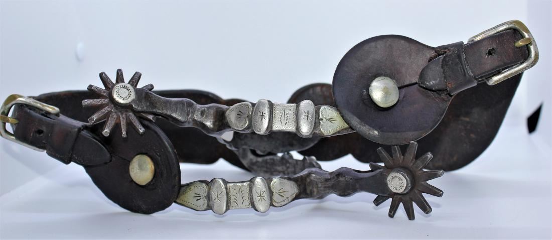 Striking fully double mounted double peanut pattern, beautifully detail engraved silver with shaped heelbands and straight shanks. Accompanied by their original flower tooled straps.