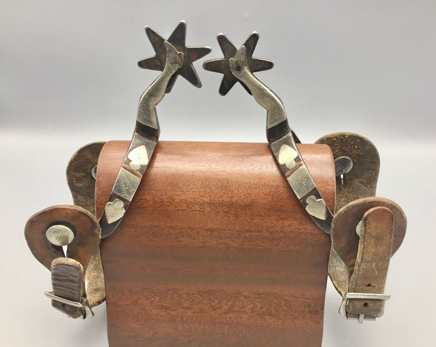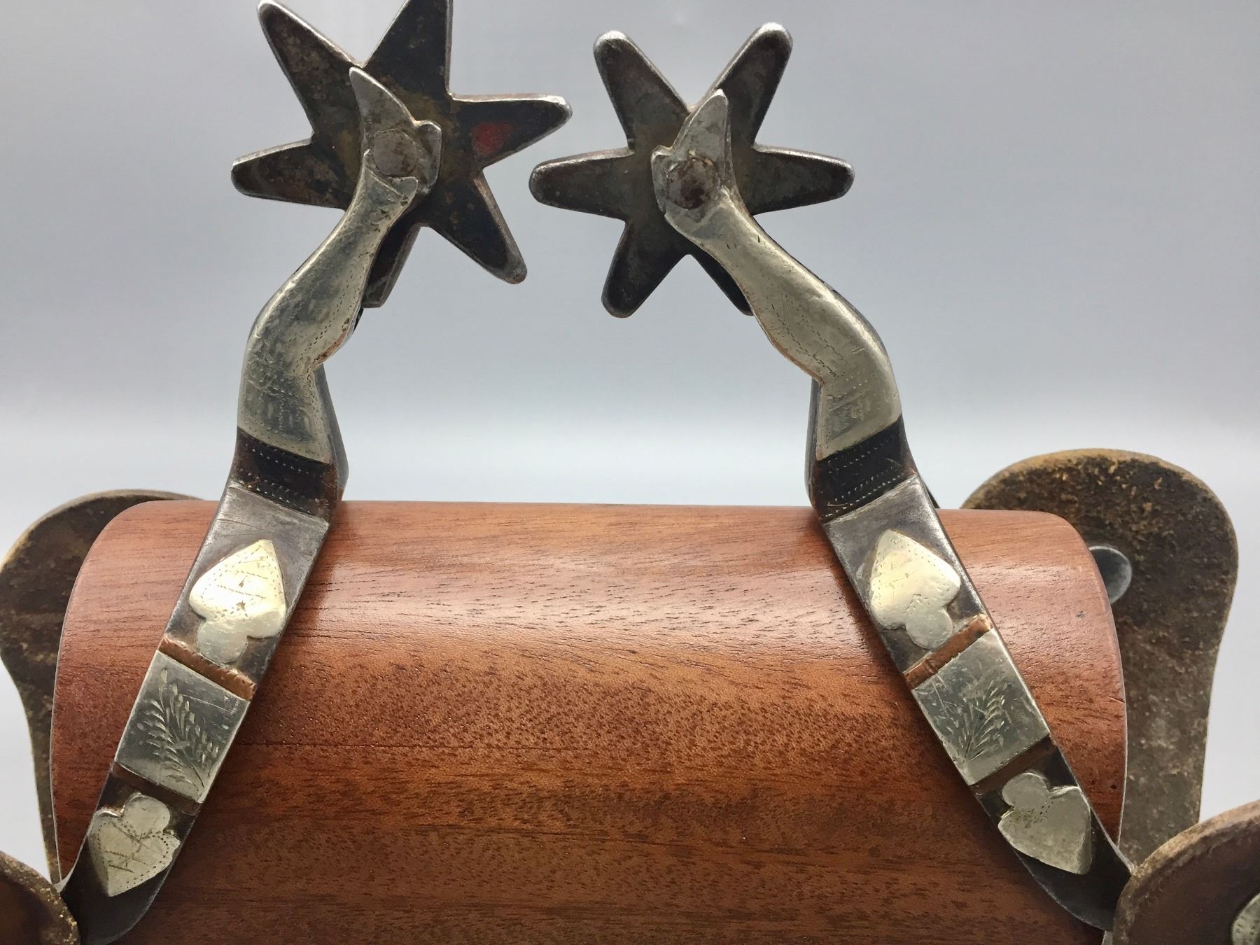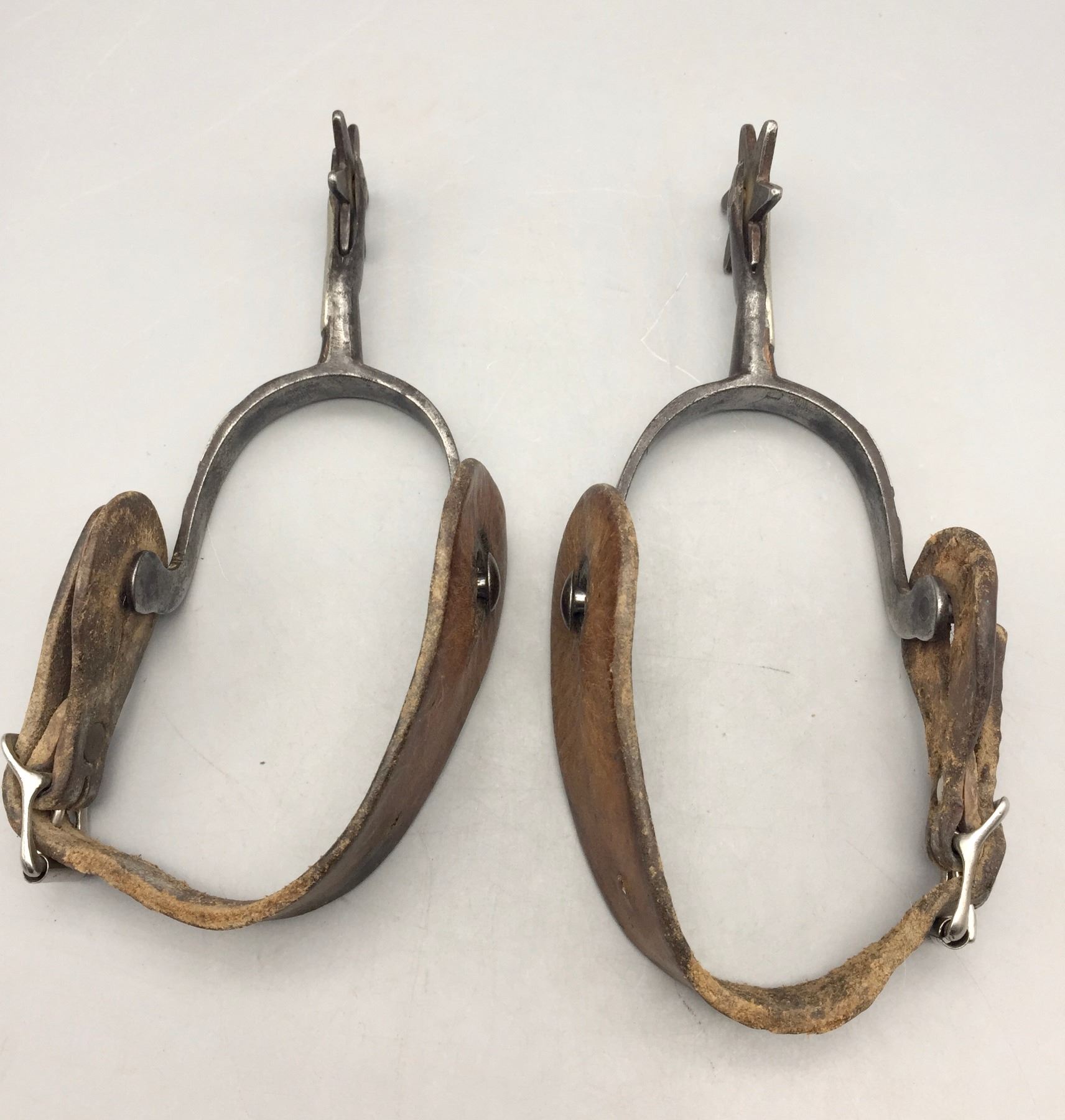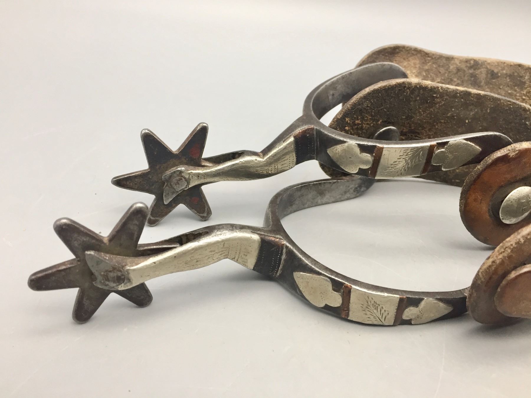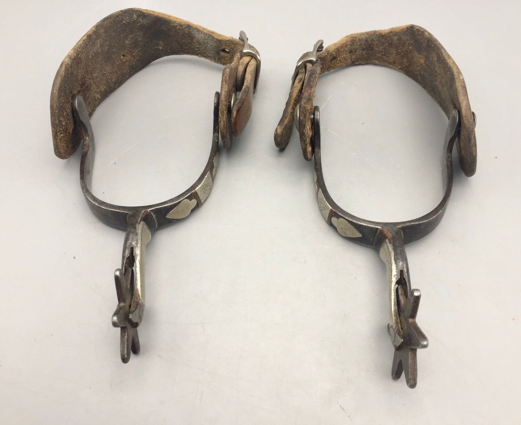 Description: Presented for sale in this lot is a pair of #8 pattern Lady Leg spurs attributed to J.R. McChesney. They include brown leather straps. Maker: Attributed to J.R. McChesney. Approx. Age: Circa early 1900s - 20s. Size: 2-1/2” heel, shank and rowel 2-3/4” and band measures approx. 3/4”. Condition: Pretty good for its age, wear expected and some silver missing on the rowel pin covers. Please look closely at the pictures - they are an important part of our description. Shipping: There will be a $5 handling / packaging fee for shipping this lot. The actual cost of postage will be added on top of that.