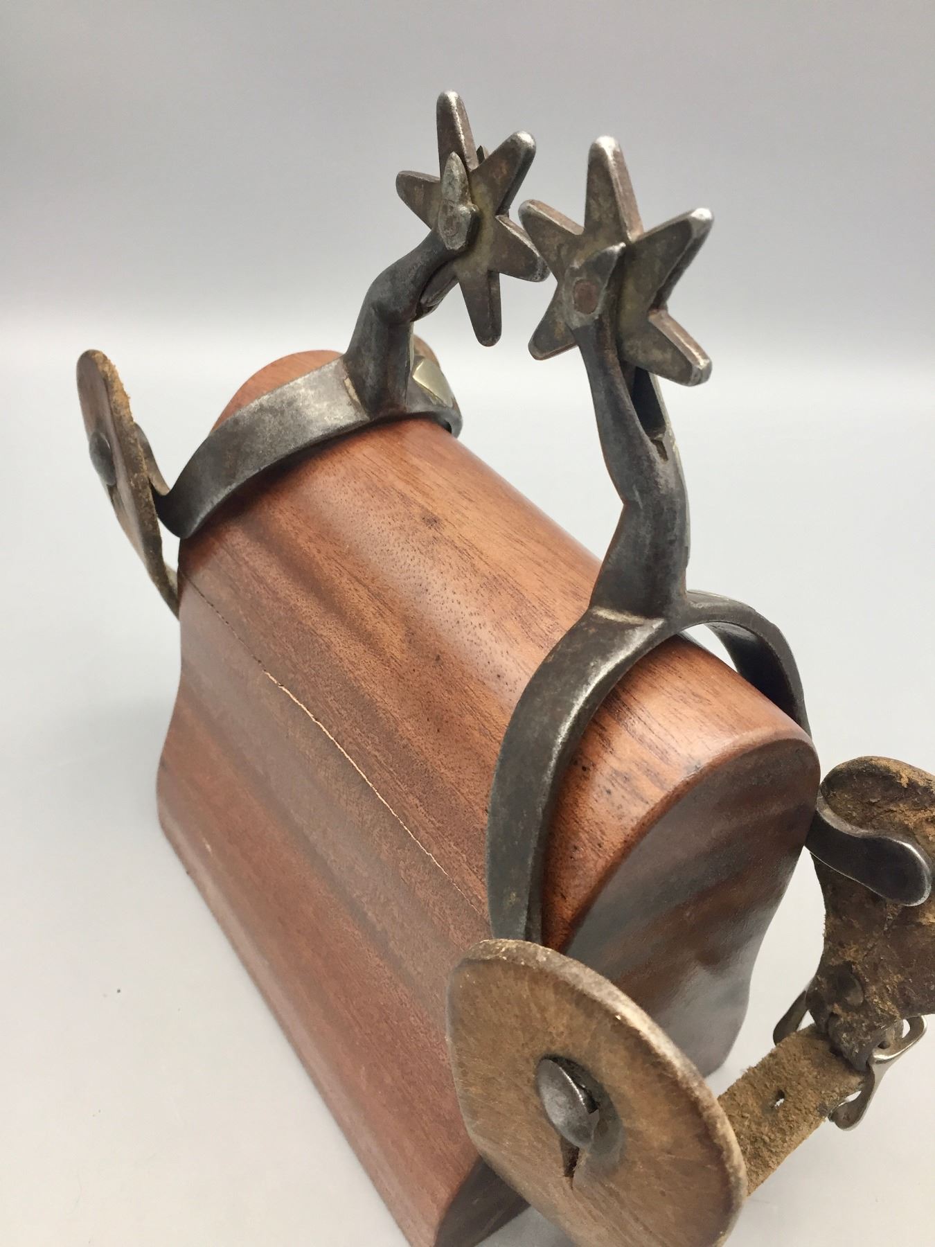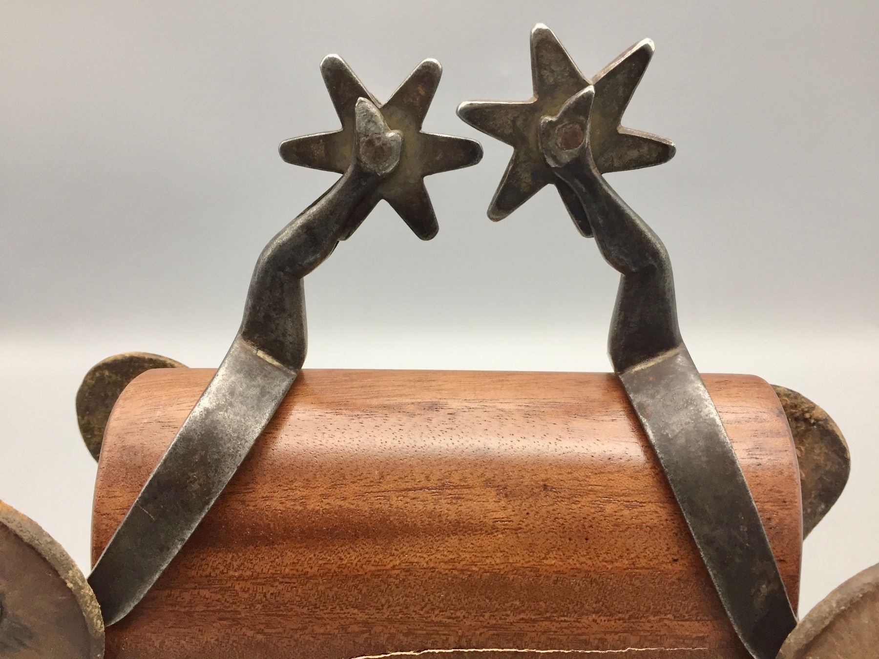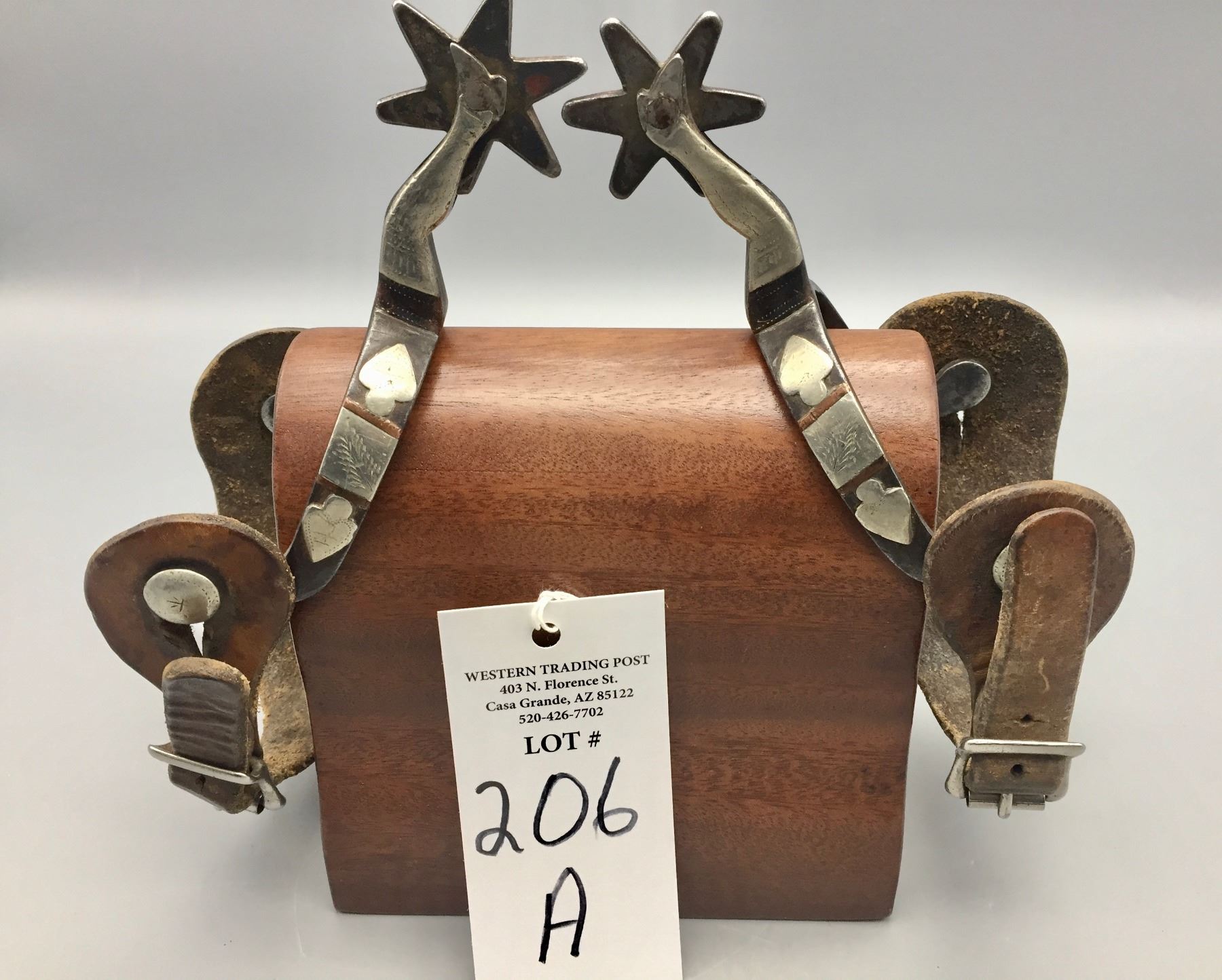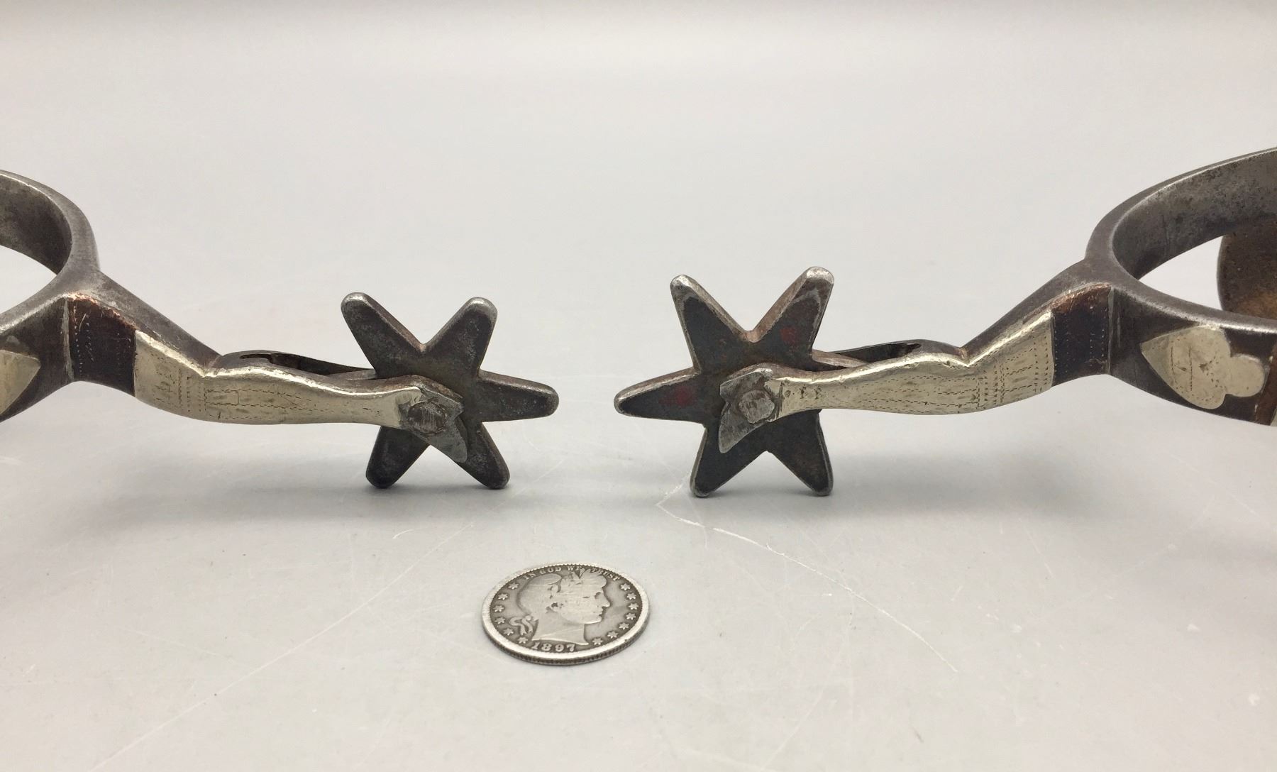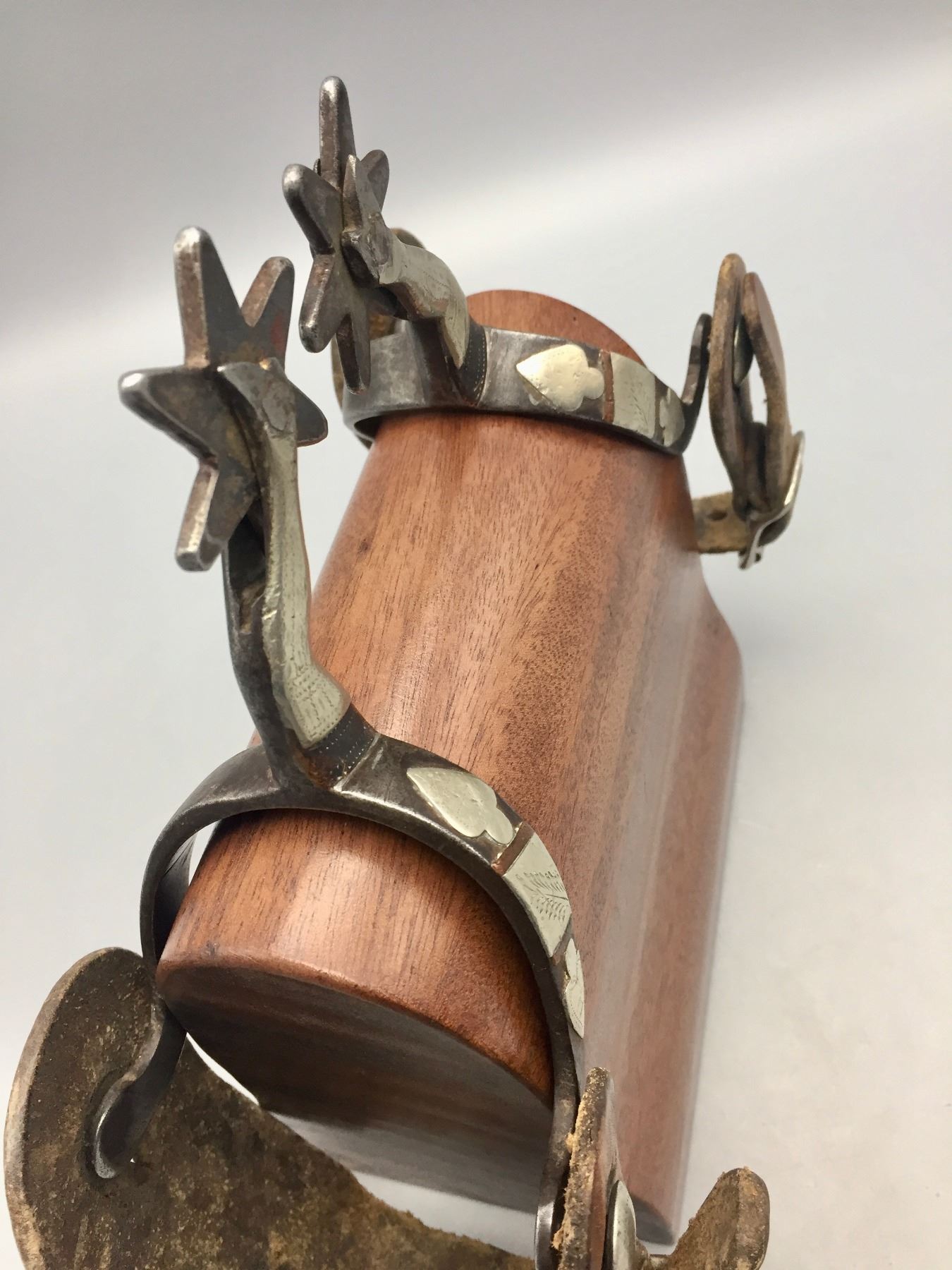 Description: Presented for sale in this lot is a pair of #8 pattern Lady Leg spurs attributed to J.R. McChesney. They include brown leather straps. Maker: Attributed to J.R. McChesney. Approx. Age: Circa early 1900s - 20s. Size: 2-1/2” heel, shank and rowel 2-3/4” and band measures approx. 3/4”. Condition: Pretty good for its age, wear expected and some silver missing on the rowel pin covers. Please look closely at the pictures - they are an important part of our description. Shipping: There will be a $5 handling / packaging fee for shipping this lot. The actual cost of postage will be added on top of that.