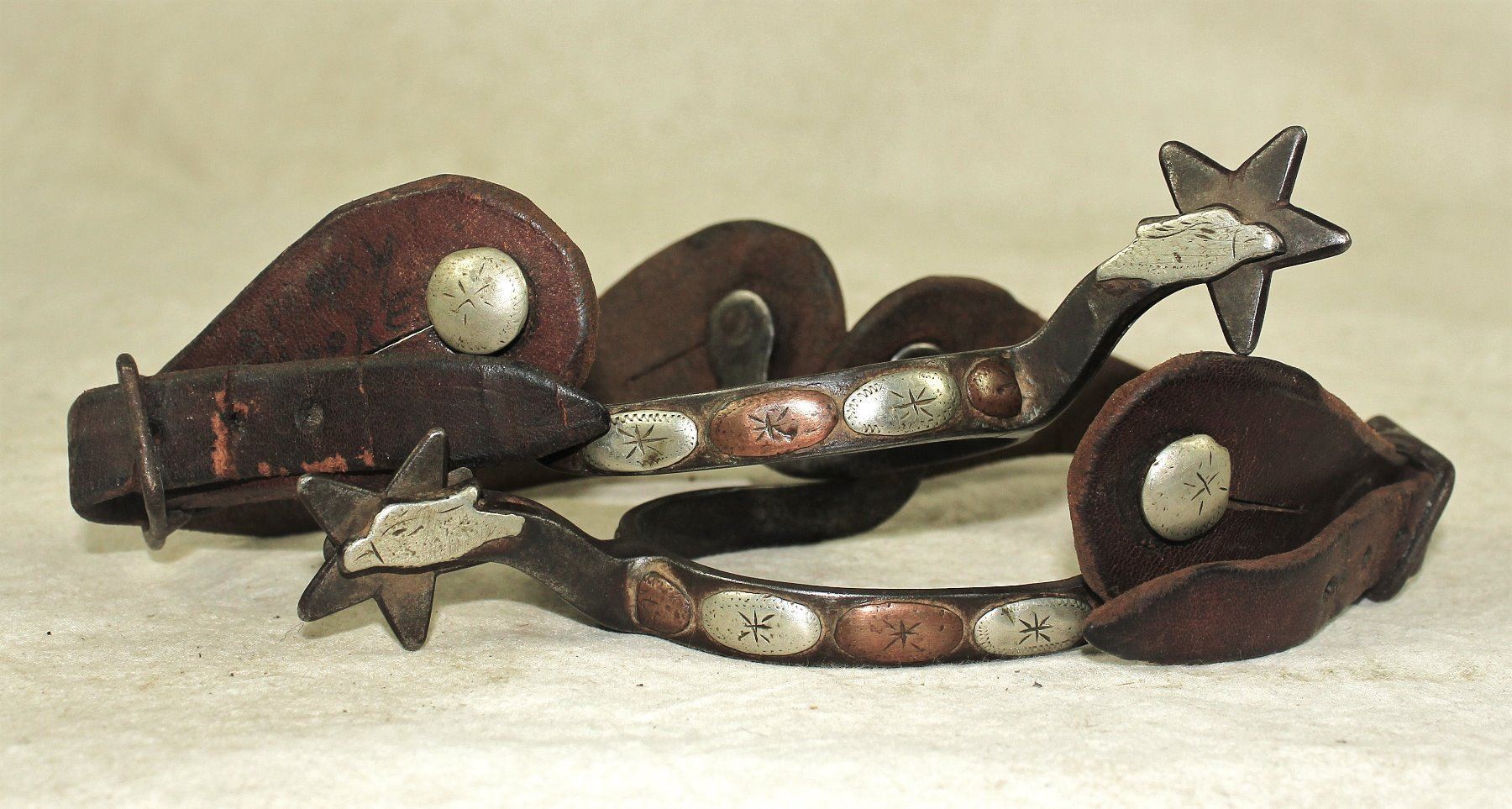 Extremely uncommon double mounted two-tone spurs with alternating silver and copper domes and five point star rowels.