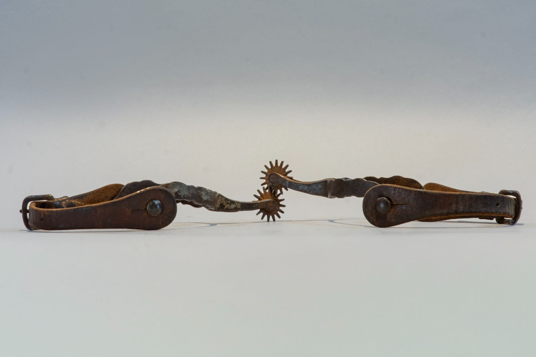 A pair of McChesney single mounted spurs with old leather straps. Spots of rust and heavy use.