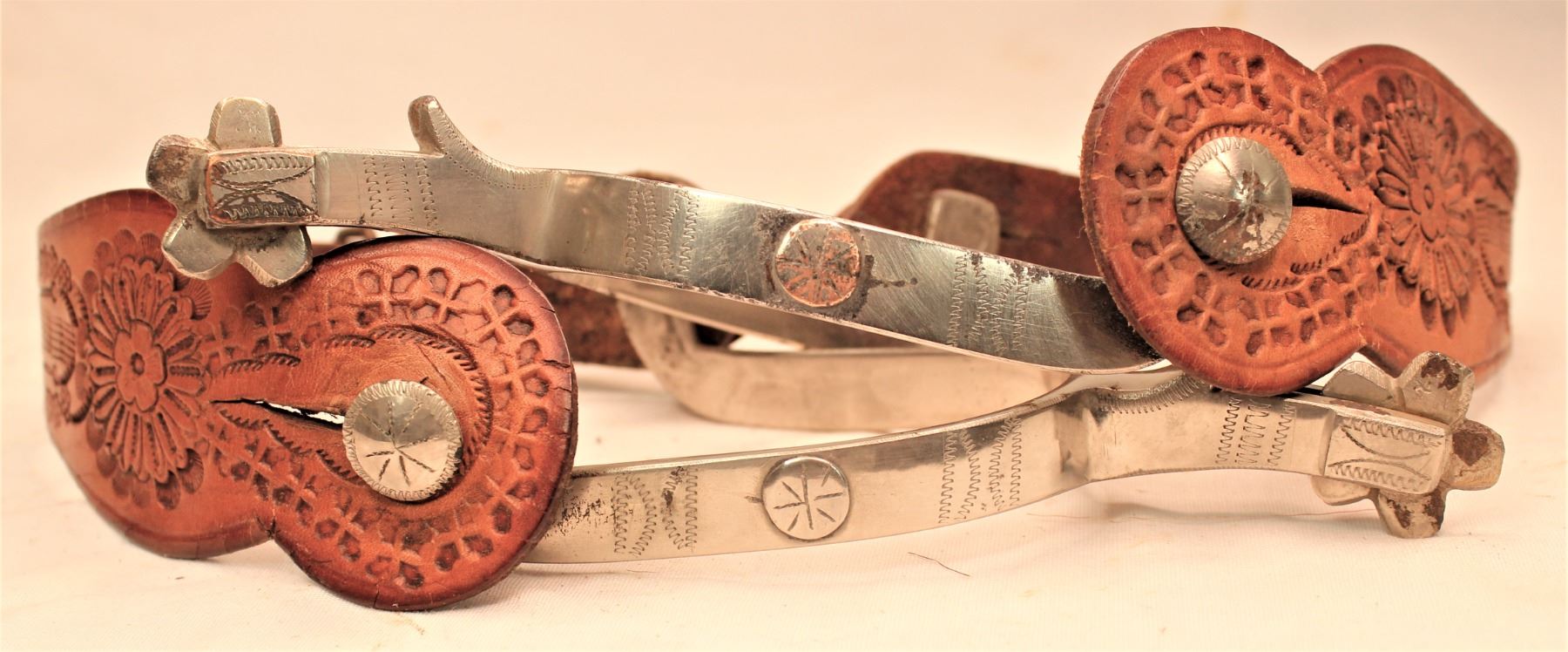 Single mounted #62-2 spurs with nickel finish and carved straps.