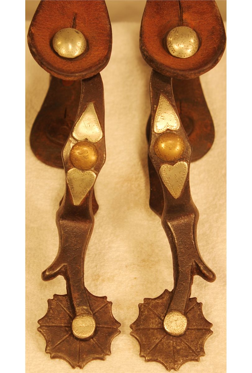McChesney Web Rowel Spurs; single mounted, with chap guards, and 1 1/2" web rowels, in nice original condition.
