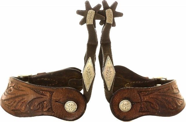 with diamond patterns, 1 5/8' shanks, 1 1/2" rowels, includes unmarked floral carved leather straps. Est. 500-800