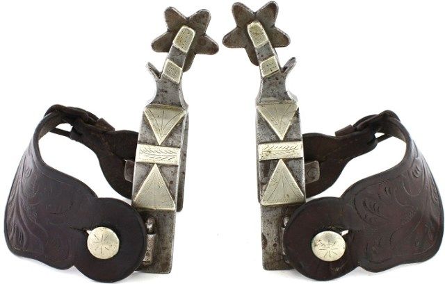 mount spurs, marked under the inner buttons, 1" heel bands, 1 3/4" shanks and 1 1/2" rowels. Includes floral carved unmarked 2 piece leather straps. Est. 800-1200