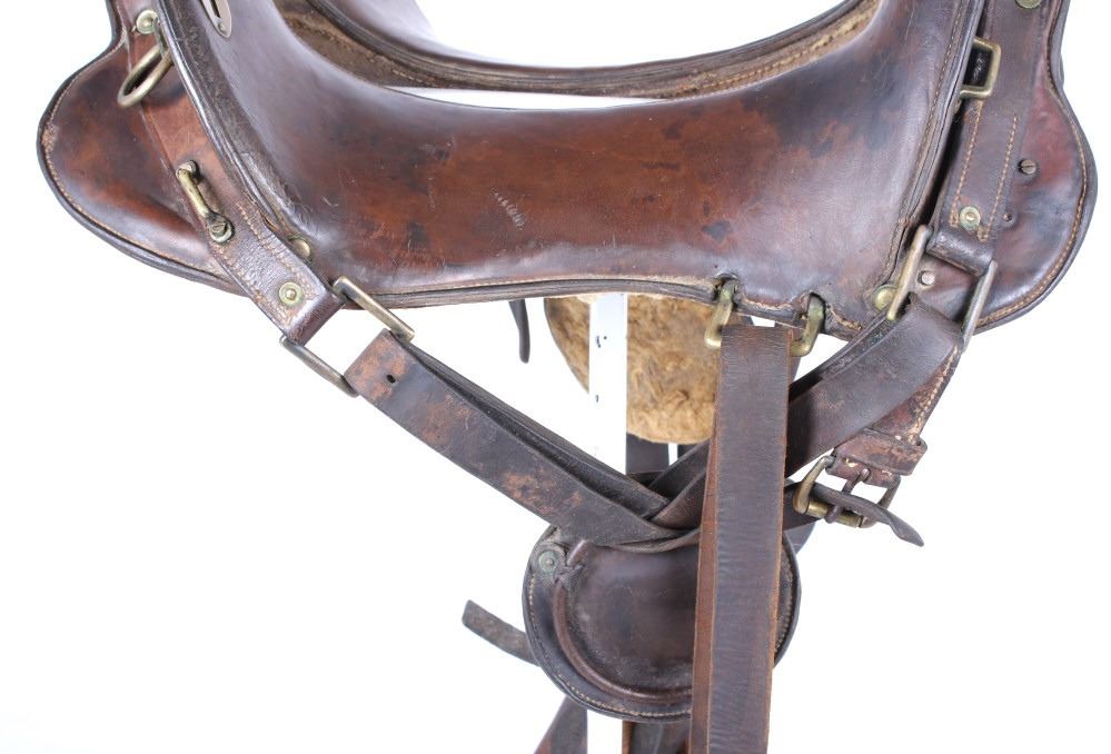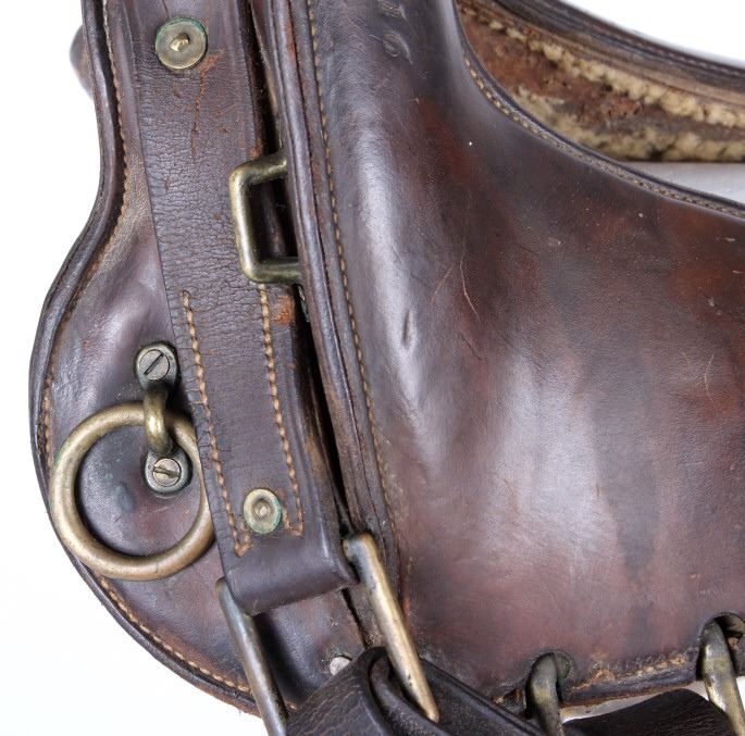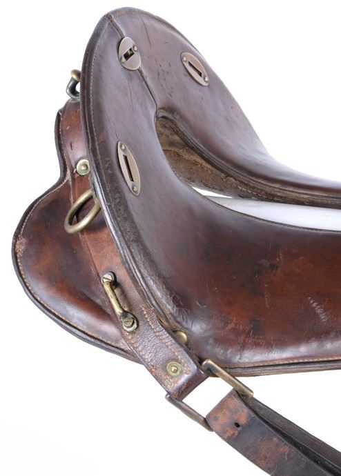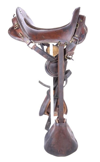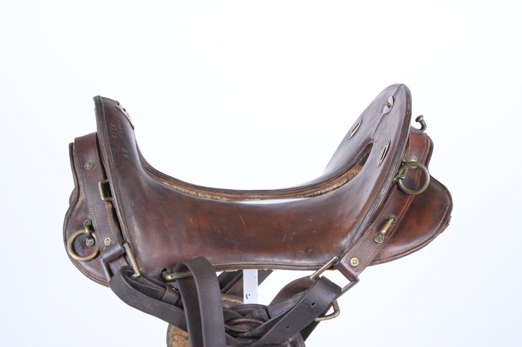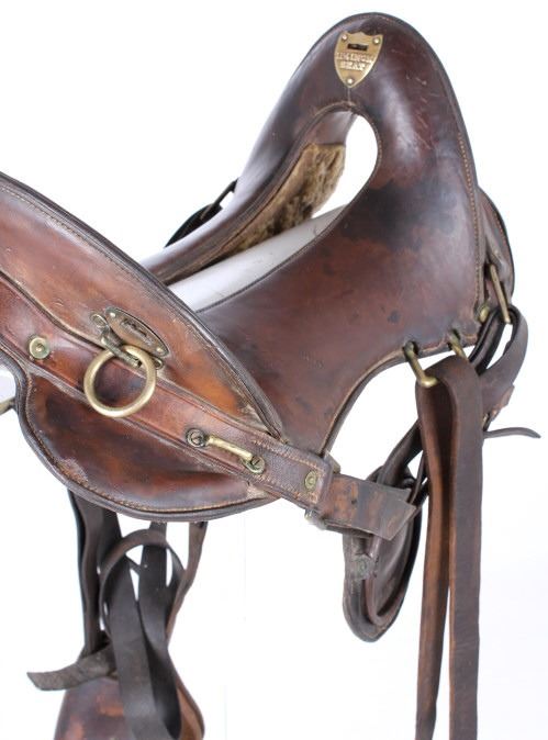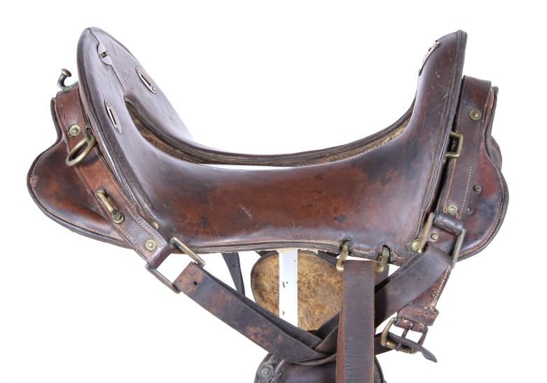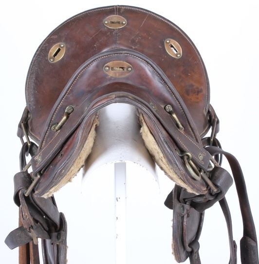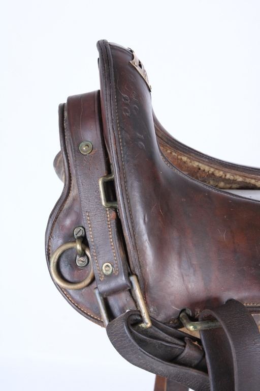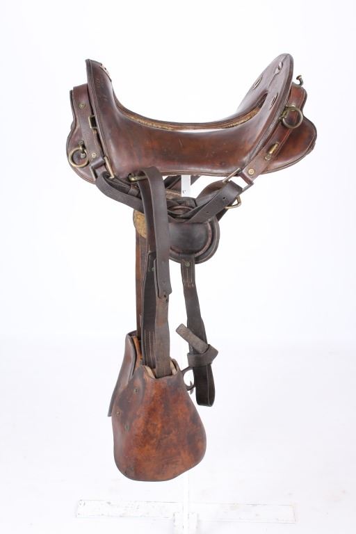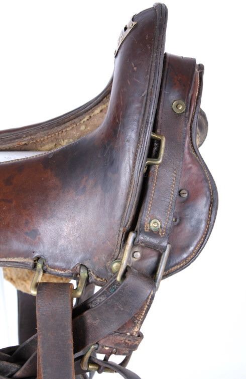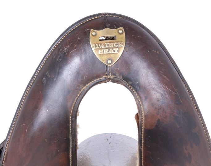 Featured in this lot we have a McClellan M1904 U.S. cavalry saddle. This saddle is constructed of authentic russet leather with brass hardware. The M1904 saddle was a a step above previous models with the 1/2" sheep skin sewn to the underside of the saddle. The saddle is stamped "U.S." on both of the stirrups and has a plaque on the horn reading "11 1/2 Inch Seat". The saddle shows good condition with some wear indicative of age. The saddle shows a 11 1/2" seat.