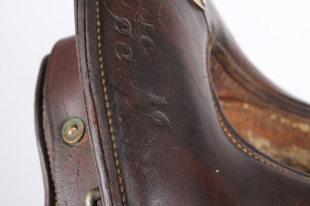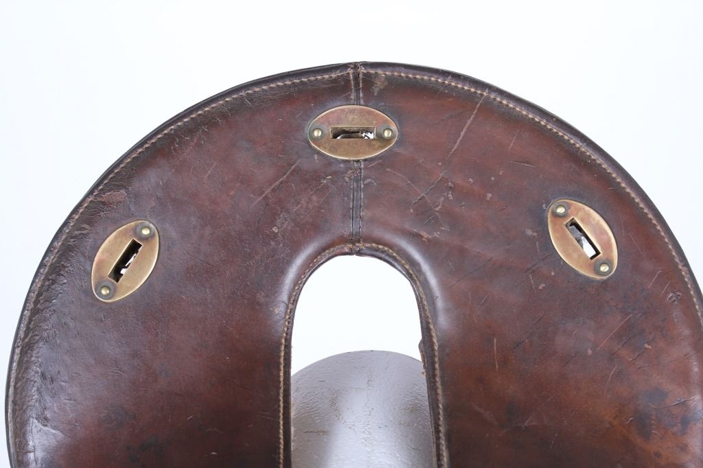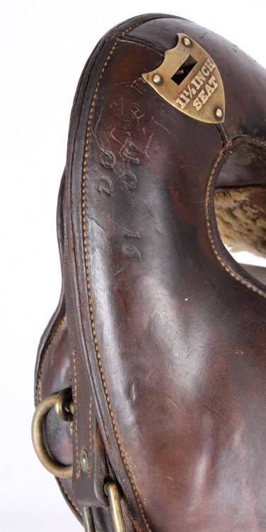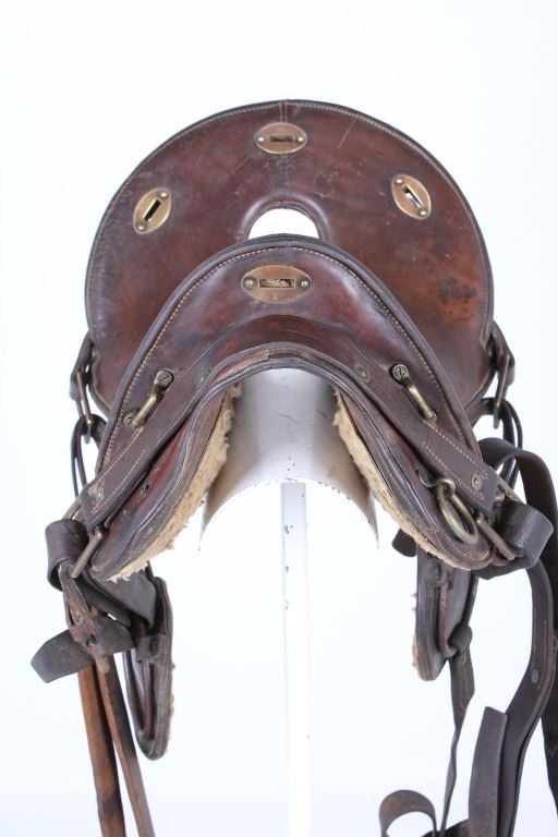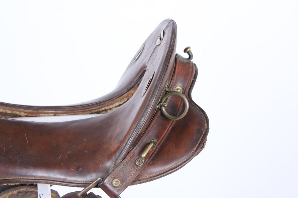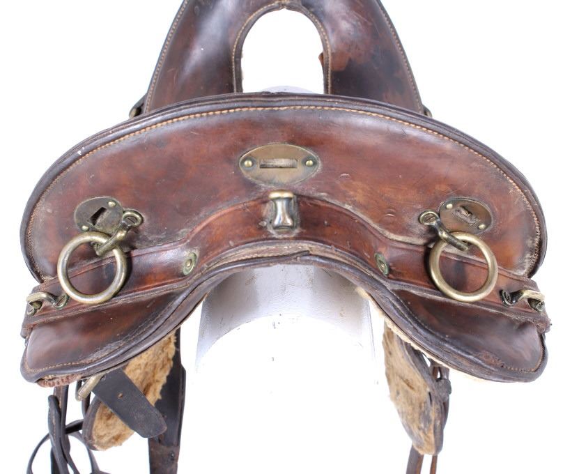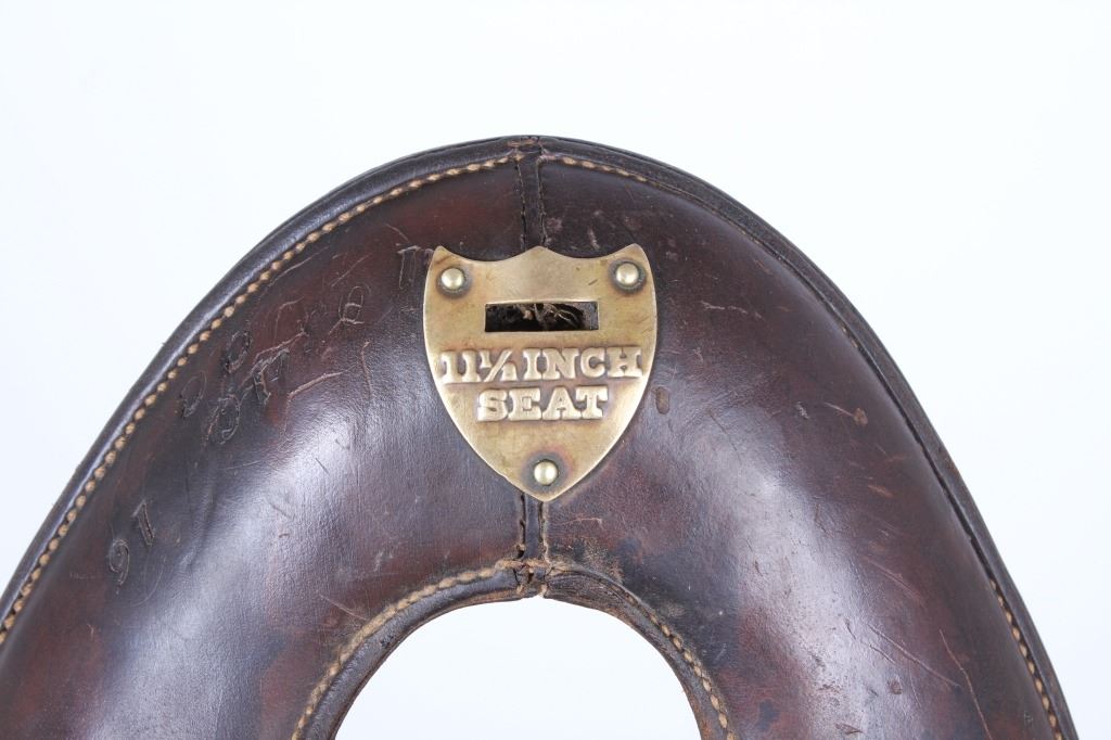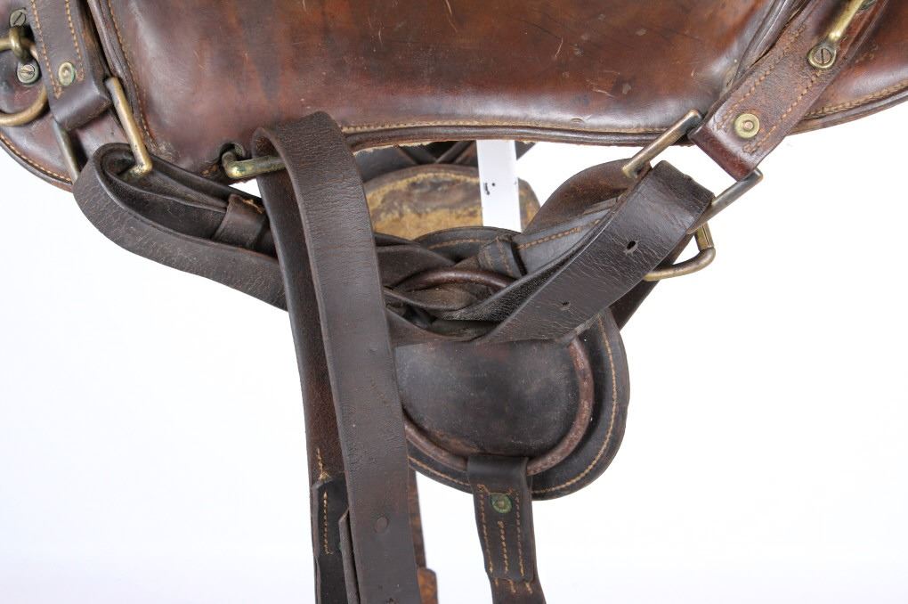 Featured in this lot we have a McClellan M1904 U.S. cavalry saddle. This saddle is constructed of authentic russet leather with brass hardware. The M1904 saddle was a a step above previous models with the 1/2" sheep skin sewn to the underside of the saddle. The saddle is stamped "U.S." on both of the stirrups and has a plaque on the horn reading "11 1/2 Inch Seat". The saddle shows good condition with some wear indicative of age. The saddle shows a 11 1/2" seat.
