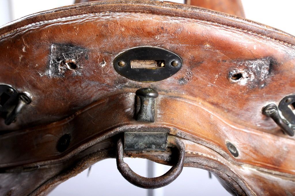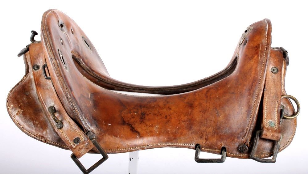 This is an 1859 McClellan Military saddle, named for George McClellan. Prior to the Civil War McClellan was part of a commission studying European military tactics, weapons, and logistics. When he came back, he developed a saddle based on a Hungarian model. The simple open-tree design proved serviceable and cost-effective, and in 1859 it was adopted by the War Department. By the end of the Civil War, nearly half a million were produced. It remained standard issue in various models for the remaining history of the U.S. Cavalry, which was dismounted in WWII (1940's). They were used by the mounted cavalry in the Indian Wars, Spanish War, Civil War, WWI, & WWII. It's still used today by ceremonial mounted units in the US Army. This saddle features a leather covered open tree with a brass rigging ring to the front right of the cantle. Front brass plate reads "11 INCH SEAT". The saddle measures 19.5" L x 14" W; it is in good condition for its age.