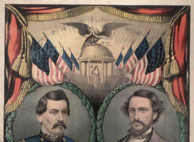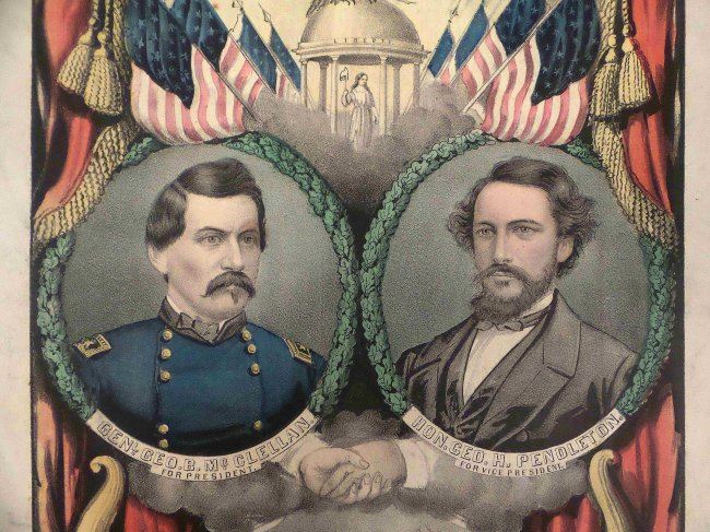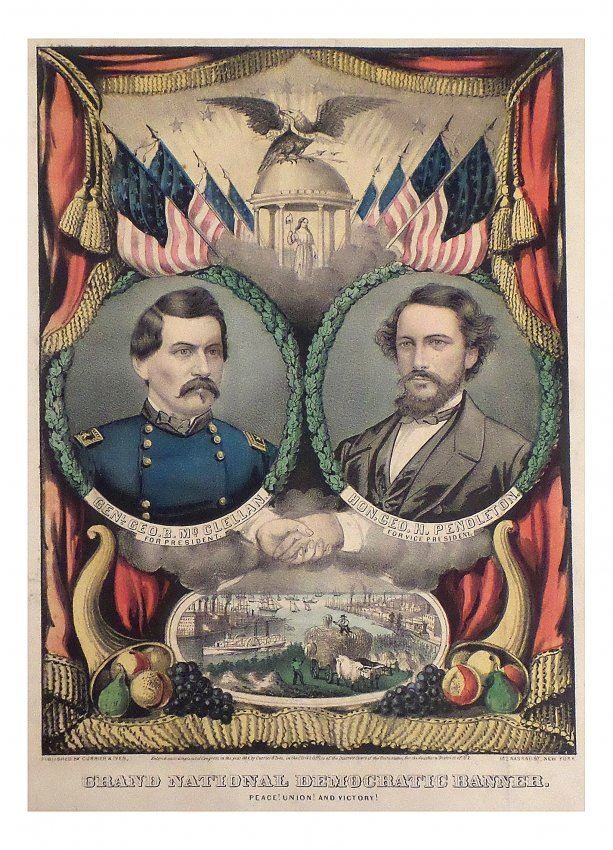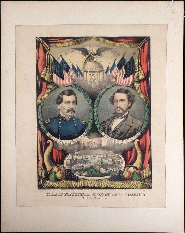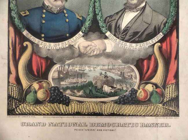 Hand-colored lithograph titled, in bottom margin, "Grand National Democratic Banner / Peace! Union! and Victory!" published by Currier & Ives, 1864. Features jugate portraits depicting General George McClellan and George H. Pendleton in laurel leaf surrounds with Lady Liberty and flag vignette above. Pictured below are two cornucopias with a farming vignette. [Image: 12" H x 8-7/8" W; Sheet: 17-6/8" H x 13-1/8" W]. Age-toning, soiling, margin tears, and proper right edge trimmed. Matted and tipped to mount with paper tape at proper right edge, bearing pencil inscription on verso.
