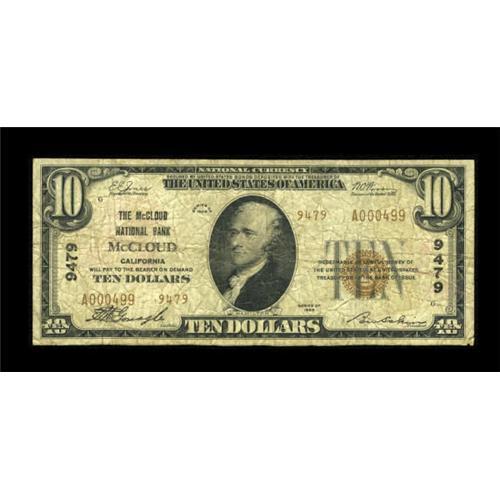 <B>McCloud, CA</B></I> - $10 1929 Ty. 2 <B>The McCloud NB</B></I> Ch. # 9479<BR> While a fair amount of small notes are known from here, three quarters of that total comes from a trio of uncut sheets which have been off the market for many years. This <B>Good-Very Good</B></I> note is listed in the Kelly census.<I><BR>From The Kansas City Collection.</B></I><BR><BR><b>Shipping:</b> Coins & Currency (<a target="_blank" href="http://www.heritageauctions.com/common/shipping.php">view shipping information</a>)