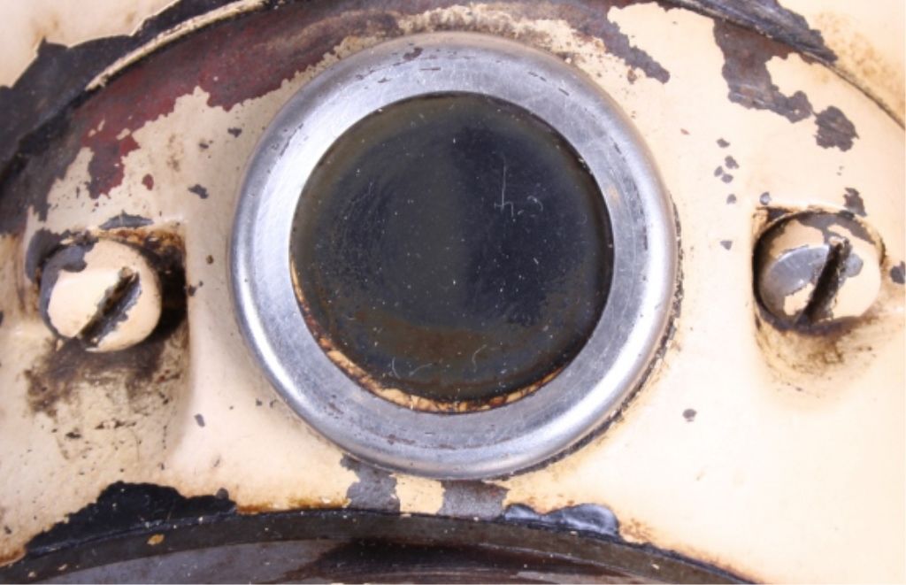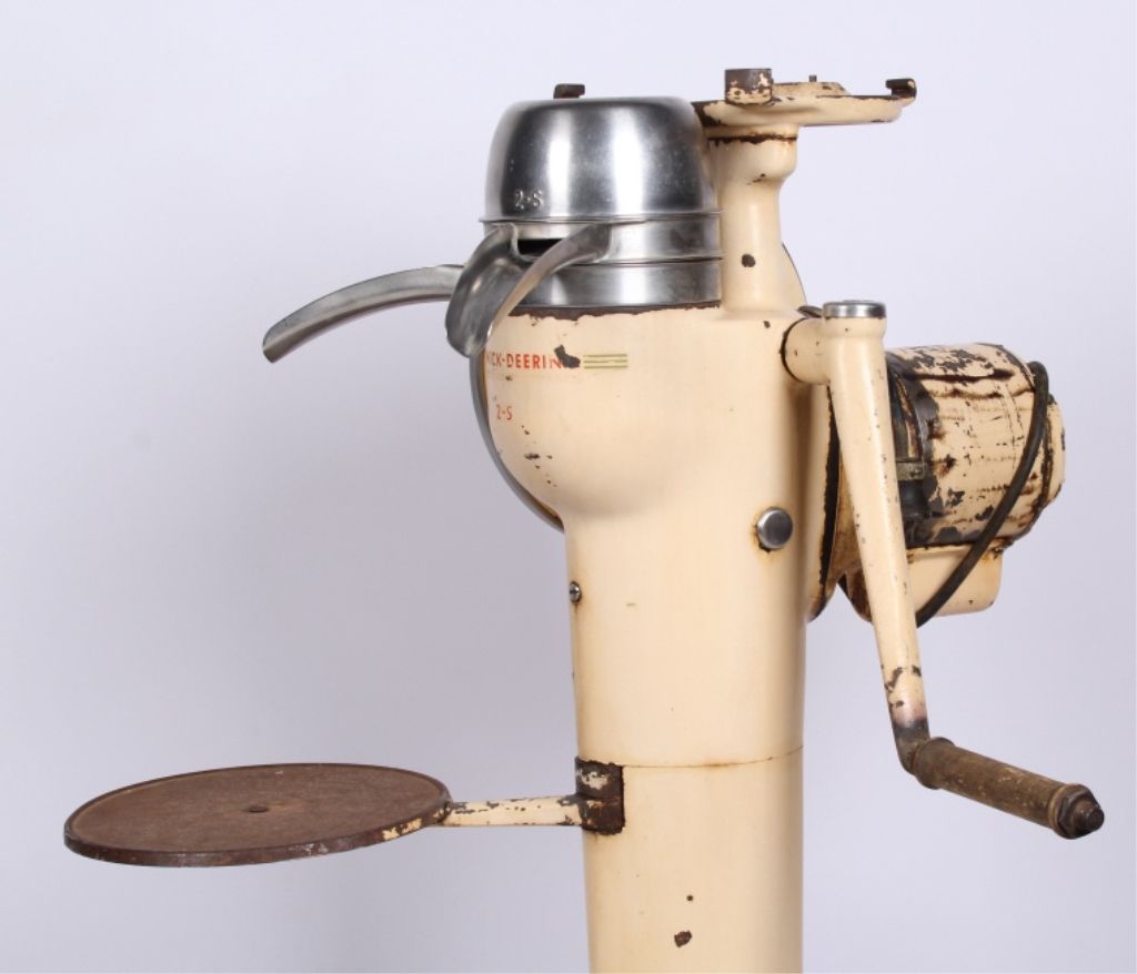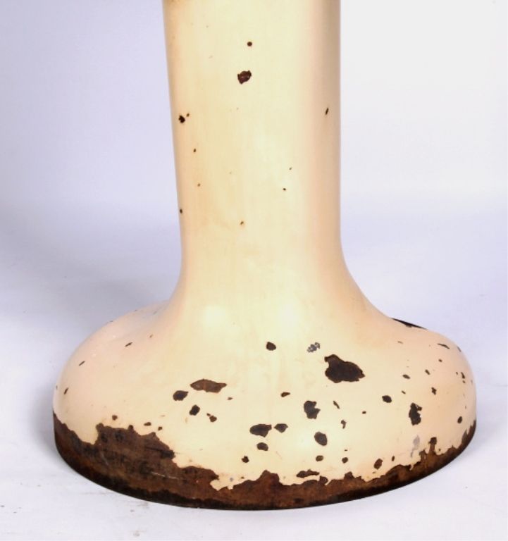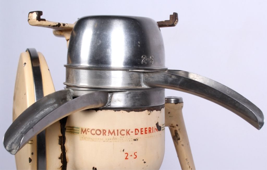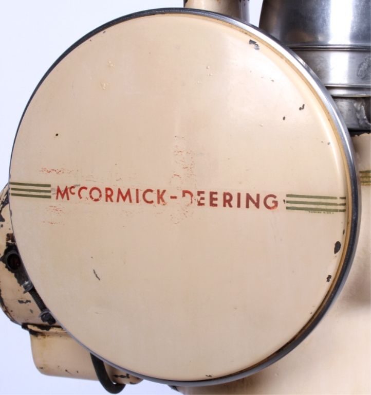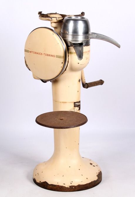 This is a KS60FZ McCormick-Deering Cream Separator in enamel tan coloring. This is missing the top churn bowl, but is a great yard art collectible. This is a newer McCormick Deering cream separator. It is amodel S-3 that first came out in 1939 was sold in the 1940's. It was a very clean, modern looking cream separator. In fact this separator was granted a design patent solely for its appearance. The patent was issuedon September 3, 1940 to Albert Scarratt of Kenilworth, Illinois and Raymond Loewy of New York, New York and William Harstick of Richmond, Indiana. These men assigned their patent to the International HarvesterCompany. Measures 13"x31"x38.5"