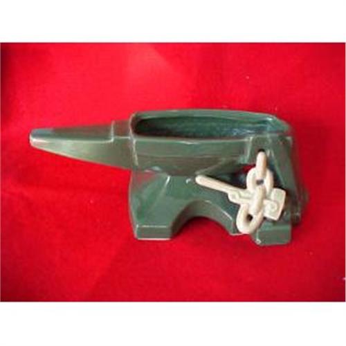 Nice green anvil planter marked McCoy comes with yellow applied hammer and chain. This piece measures 9 inches long and does have some age crazing which is light and one what appears to be a surface crack on the hammer.