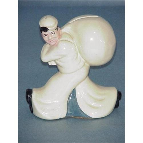 A bank given by the Seamen's Bank for savings, 5 1/2" tall, 5 1/2" long, made by McCoy pottery Co. modeled as a salior on leave carrying his gear in a large sack slung over his shoulder. Given as a premium to bank customers to encourage saving your small change. The condition is as is because there is a chip, shown, on the coin slot.