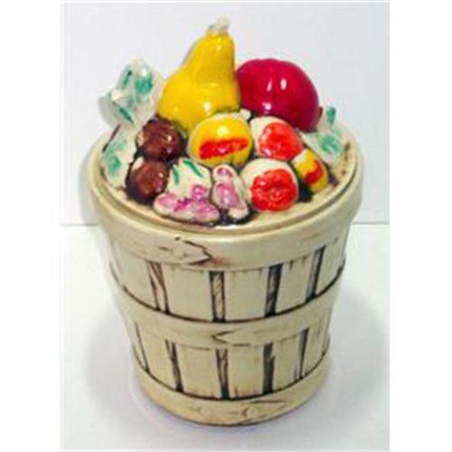 This McCoy Bushel Basket of fruit cookie jar was produced in 1961. The lid features an assortment of fruit figurals and the jar resembles a panelled basket. The jar measures 12in. x 8in. With minimal wear to the cold paint, this great cookie jar is marked McCoy U.S.A.on the bottom and, with the exception of mild crazing on the inside and outside of a small part of the bottom [see photo], both jar and lid are in excellent condition.