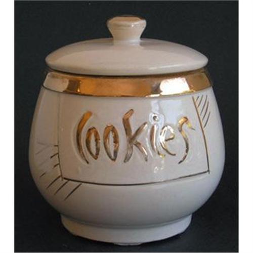 Produced by McCoy, circa 1964, round in shape, in a soft white color and copiously trimmed in gold. Front has the word 'Cookies' in gold. Ink marked, on the bottom, as described in our book, but the marking is no longer legible, measures 8 1/4" tall, and with the exception of some wear to the gold, both the jar and lid are in excellent condition - no crazing