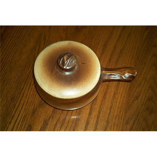 Featuring a McCoy, covered soup bowl with handle. Creamy-Brown colored. Round decorative knob and decorative handle. The knob and handle displays a nut and limb of a tree. Bottom embossed McCoy. Bowl measures 2 5/8 inches tall; opening diameter measures 4 1/2 inches; depth of the bowl measures 2 1/4 inches; base diameter measures 7 1/2 inches; handle measures 2 1/4 inches long. The inside is higly glazed. Excellent to mint condition. No chips, cracks, etc.