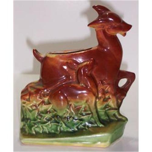 This gorgeous glossy planter depicts a doe and fawn figurals romping through shrubbery. It was produced in the 1940's,and is currently hard to find. The detail and color are exquisite. The dimensions are 7.5in. tall x 6in. wide x 2.5in. deep and in very good condition.
