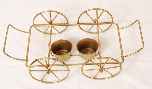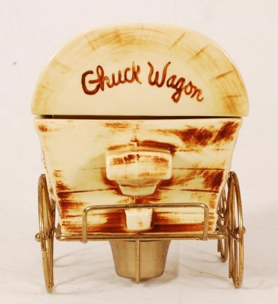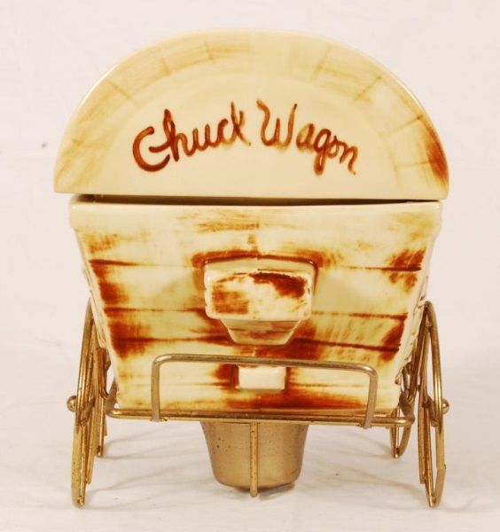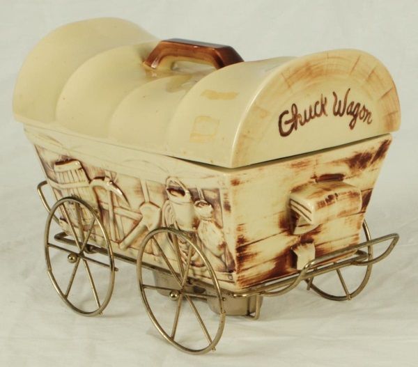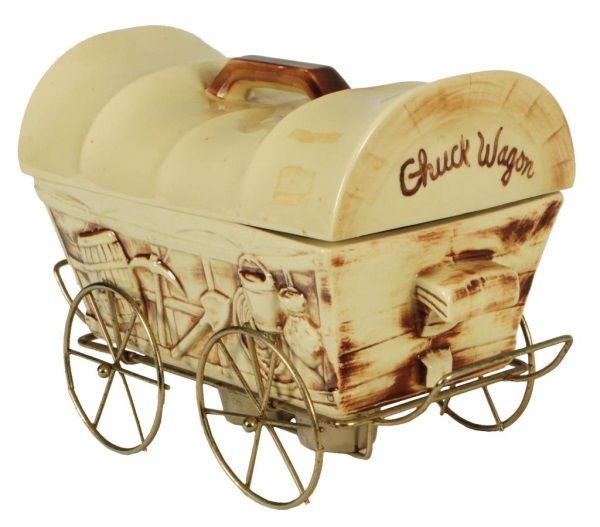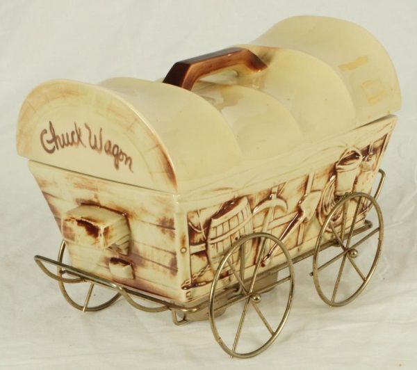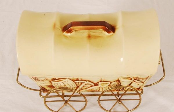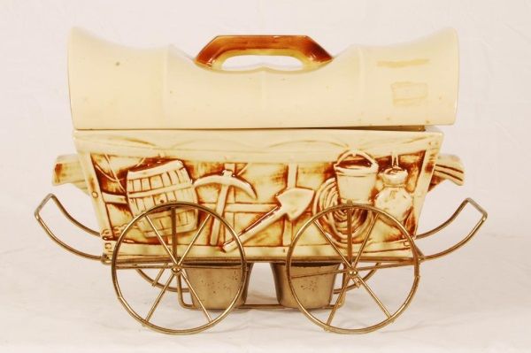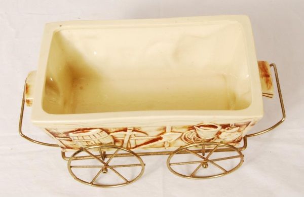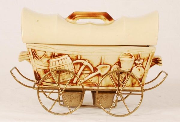 2 Piece, wagon sets on wire stand. Circa 1960. Measures 13" long, 6 1/2" wide, 9" tall.