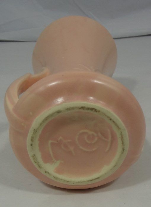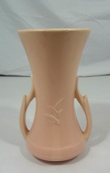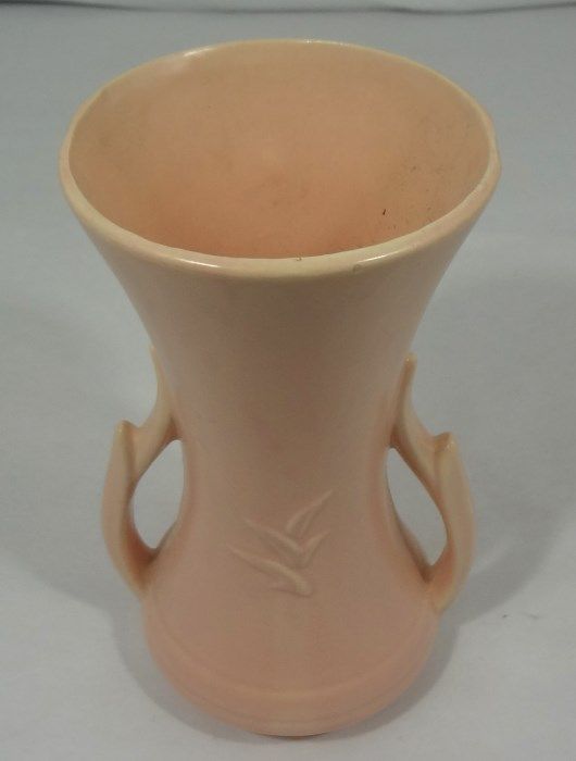 McCoy matte coral vase with handles. This piece is in great condition! Est Value $15.00-30.00