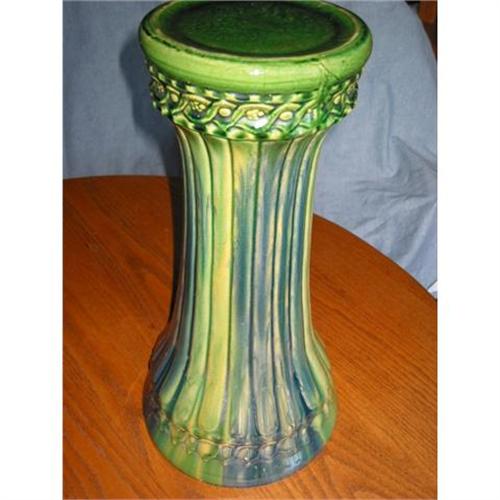 <table width="100%" border="0" cellspacing="0" cellpadding="4"><tr><td><em> WOW! This is one big, beautiful pedestal!</em></td></tr><tr> <td width="100%"> McCoy Pottery Blended Glaze Pedestal. Fabulous! For your consideration is a gorgeous pedestal made by McCoy. It is not marked, and the book does not specify whether any of these were ever marked, but it does match the one shown on pg. 16, of Vol. l by B. Hanson, except the mixed glaze color is slightly different; (the one shown in the book is green, brown and orange; this one is green, brown, blue, and yellow), same exact design pattern though. The pedestals and jardinaires came in a variety of mixed colors. Pictures 3 & 4 show the detail of the top and bottom part of this pedestal so you can compare it with the one in the book. The design and dimensions are identical as the one pictured in the book. This heavy, beautiful pedestal is 19 inches high and has no chips. It does have one tight, fine hairline on interior bottom; (I had to turn it upside down and look at it under a strong light to detect it). As you can see in one of the pictures, my RRP Roseville jardinaire looks quite lovely atop it! Guaranteed vintage McCoy pottery. Paypal users must be verified buyers with confirmed address. Shipping within continental USA only. </td></tr><tr> <td> </td></tr><tr> <td>Reference #: pmc204061</td></tr><tr><td>Condition:good</td></tr><tr><td>Year:est: 1920-40's</td></tr><tr><td>Country:USA</td></tr><tr><td>Maker:McCoy Pottery Co.</td></tr><tr><td>Height:19</td></tr><tr><td>Title:McCoy Pottery Blended Glaze Pedestal</td></tr><tr><td>Location:rochester hills, michigan</td></tr></table>