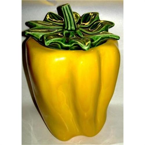 McCOY ART POTTERY YELLOW PEPPER COOKIE JAR. Here is McCoy's yellow pepper cookie jar with its high-gloss finish and in beautiful condition. It stands about 10" tall from bottom to tip of stem. It does have some chips on the bottom where it sits (see picture), but not noticeable from its normal sitting position. The lid has three small "slices" in the glaze that appear to be factory flaws and a little of the glaze has been rubbed off the "leaves" on the edges, which is normal wear condition. None of it is detrimental. It is marked #157 McCoy USA on the bottom. I believe this is 1970's - 1980's vintage. Shipping, handling and insurance is $20.00.