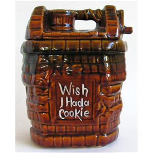 Known as the WISH I HAD A COOKIE cookie jar this HTF piece was produced by McCoy, circa 1970, and shaped like a wishing well. Marked McCoy USA on the bottom, it stands 9 inches tall with both the jar and lid in excellent condition - no crazing or any damage