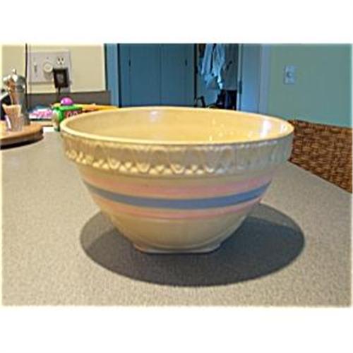 This is a 9.5" old pink and blue stripe bowl. It has a square bottom and is marked USA on the bottom. It's a wonderful aged yellow color with no chips or cracks. It does show some utensil marks and rough spots in the mold but one would expect that. Overall it's in very good condition, so if you like yelloware, this might be the one you've been waiting for.