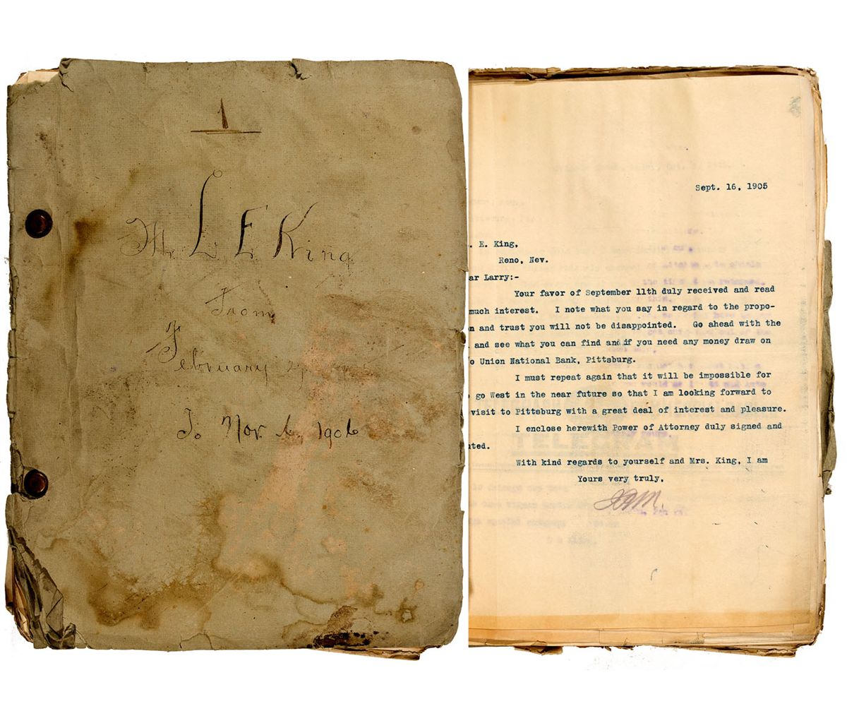 1904-1906 - Over 200 letters between McCune, who resided in Pittsburgh, Pa. and several different people in the west. He wrote to mining engineers, Thomas Darby of Goldfield and Edwin Hawkins, of Denver, discussing mining different mining ventures.  McCune eventually hired a manager, Larry King, to look over, buy, sell or work mining properties in the west.  Most of the exchanges are between King and McCune.  King looks at property in Olinghouse, which will add another layer to the known history of the place.  He was very enthusiastic about Olinghouse and bought up shares of several different mining companies for McCune.  There are many letters about Goldfield and the difficulty in getting land patents there.  McCune was sued over property infringements there.  Also the letters reveal information about mining unions and mining in California in Pacific [House] and in Placerville.  More importantly, the letters speak of how easy it was to take advantage of absentee owners with hopes of making it rich in mining ventures.  McCune was from a wealthy Pennsylvania banking family and wanted to make more money in mining.  His ventures did not work out that way.  The letters show how King took McCune for $12,000.00 in one year`s time while bolding pressing for more things in the way of purchasing an automobile and home for King.  McCune drew the line there.  All very respectably done.  A great read!  Most of the letters here are hand written but easy to read and full of details about mining.  The letters are in good shape.    -52214