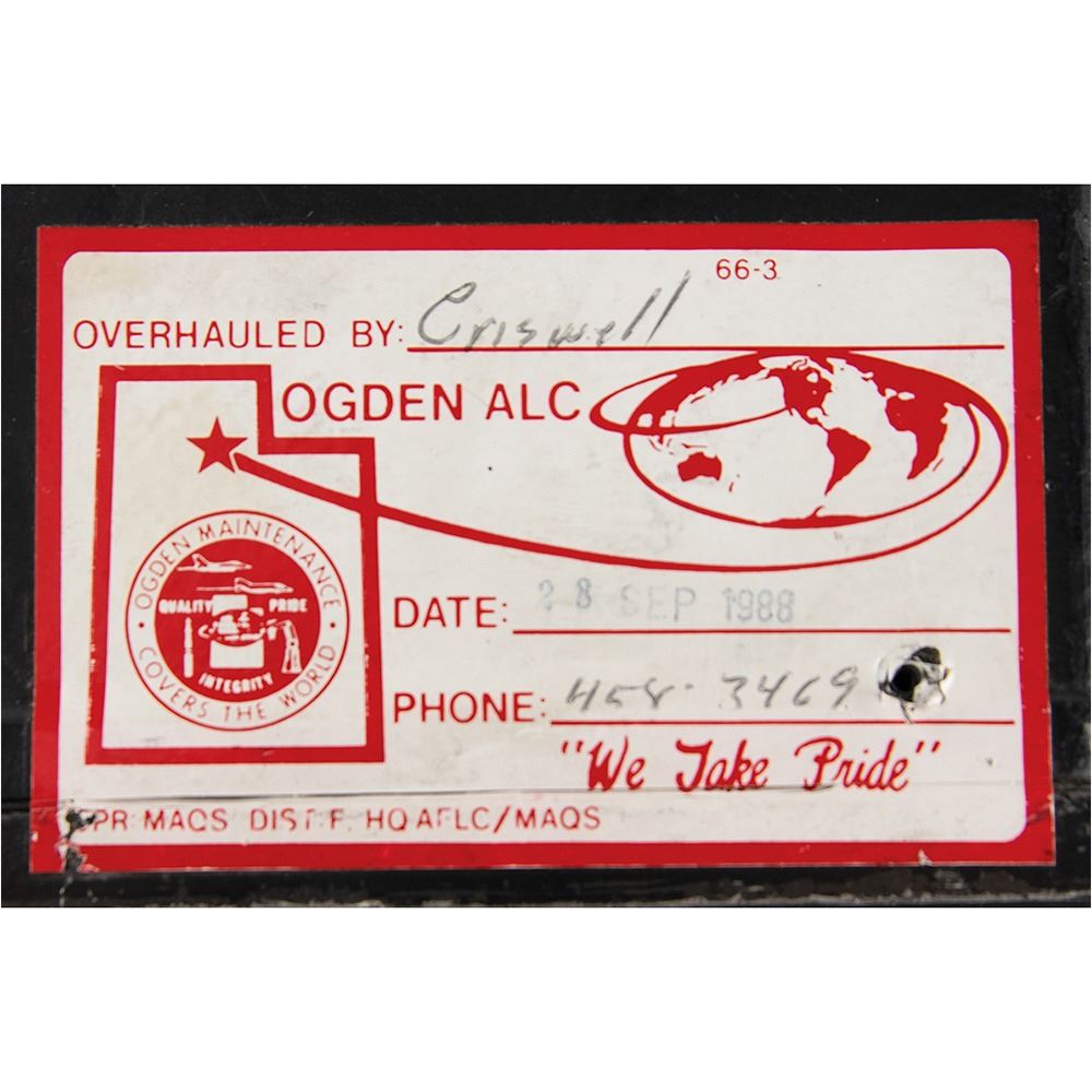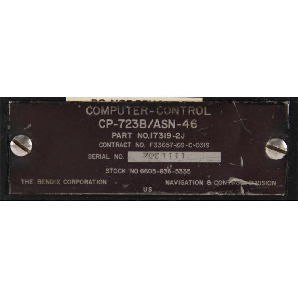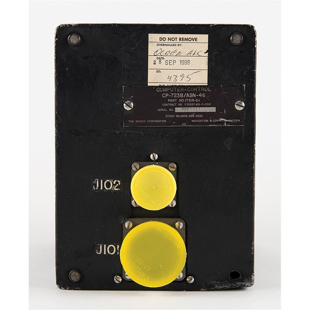 Navigation computer control box (CP723B/ASN-46) built by the Bendix Corporation for the McDonnell Douglas F-4 Phantom II fighter jet, measuring 5.75è x 6.75è x 7.5è, with Bendix plate on the reverse: "Computer-Control, CP-723B/ASN-46, Part No. 17319-2J, Contract No. F33657-69-C-0319, Serial No. 6605-836-5335." The elapsed time ticker on the side reads "4395 Hours," and affixed service tags indicate the unit was overhauled on September 8, 1988. This unit, part of the F-4's Inertial Navigation System, would be used by a Radar Intercept Officer (RIO) to dial in the latitude and longitude of up to two different targets. This item is ITAR restricted; no export or sale to non-US citizens.