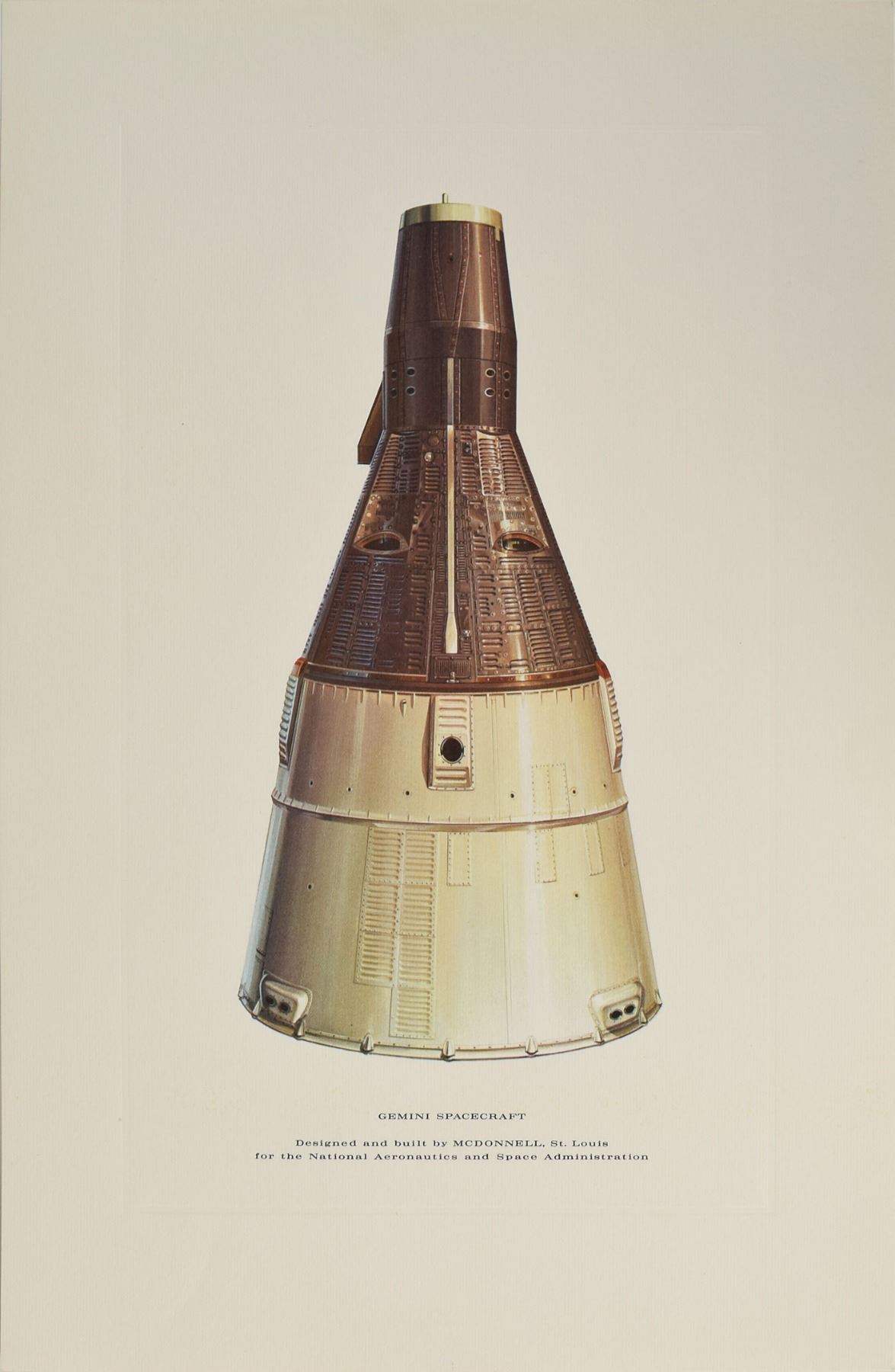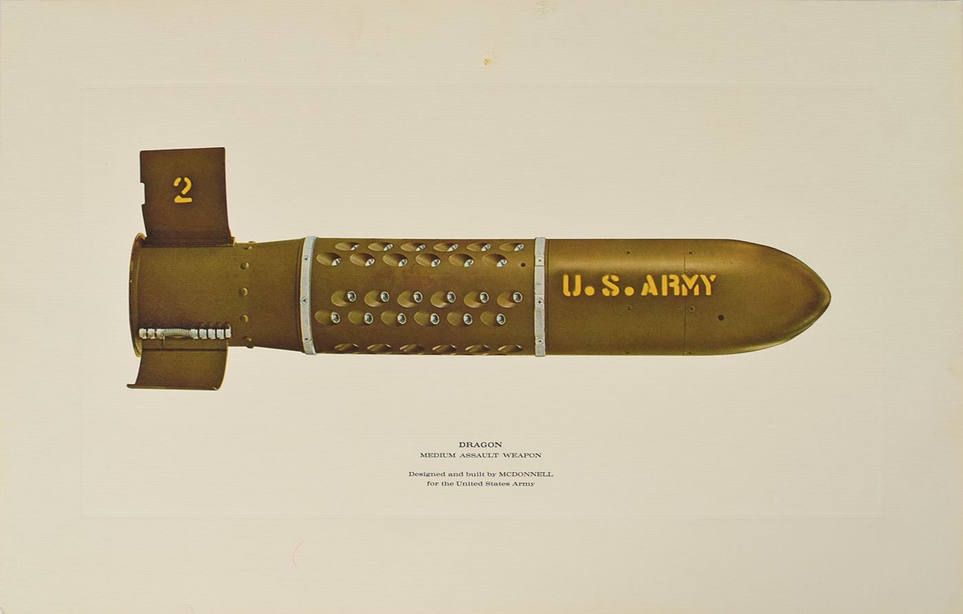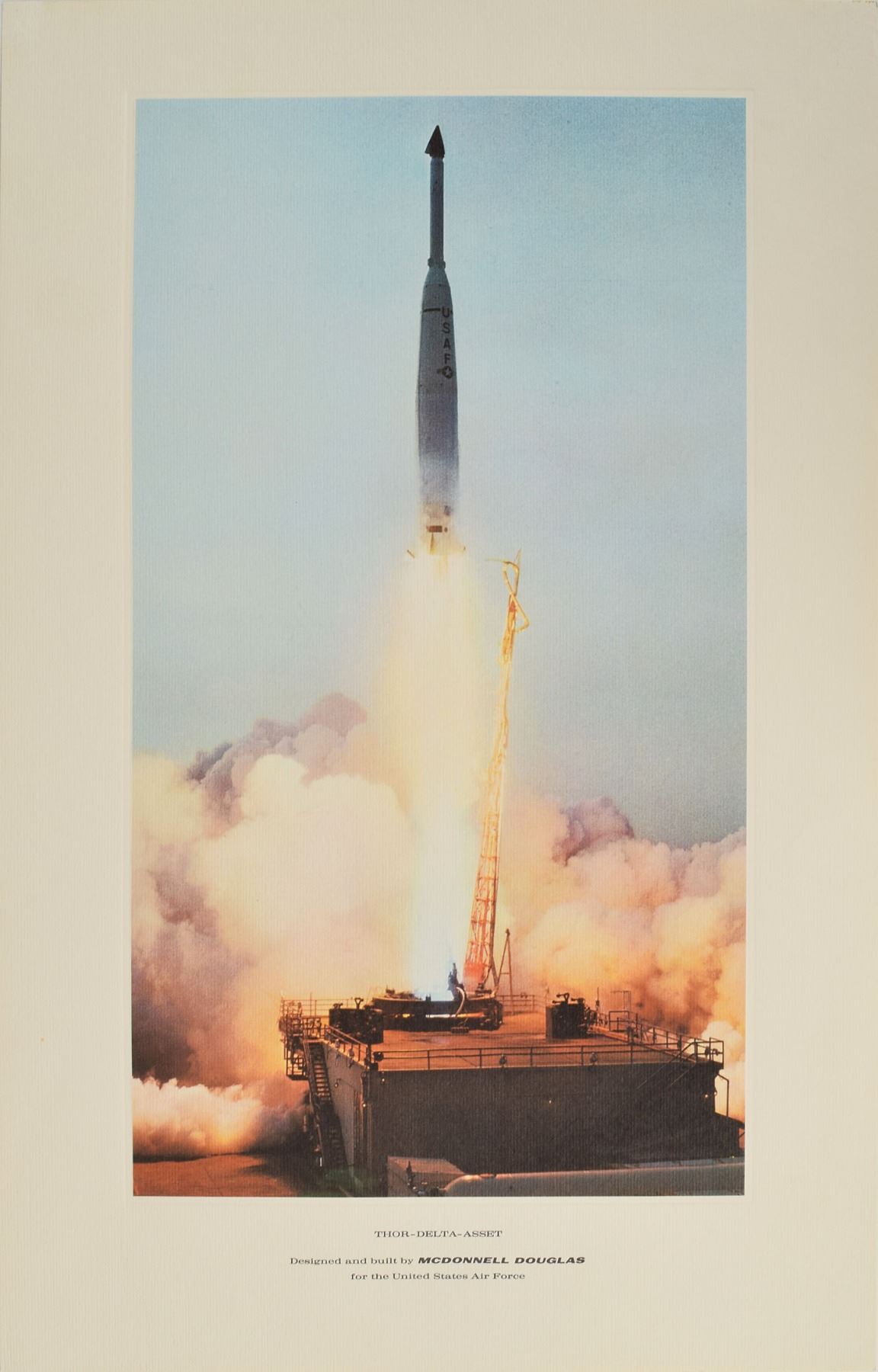 Set of seven high-quality color lithographs, 11 x 17 and 17 x 11, depicting projects completed by McDonnell, with subjects including: the Mercury Spacecraft, the Gemini Spacecraft (3), the Thor-Delta rocket, the Douglas DC-9 plane, and the Dragon Medium Assault Weapon. In overall very fine condition. Accompanied by the original mailing envelope.