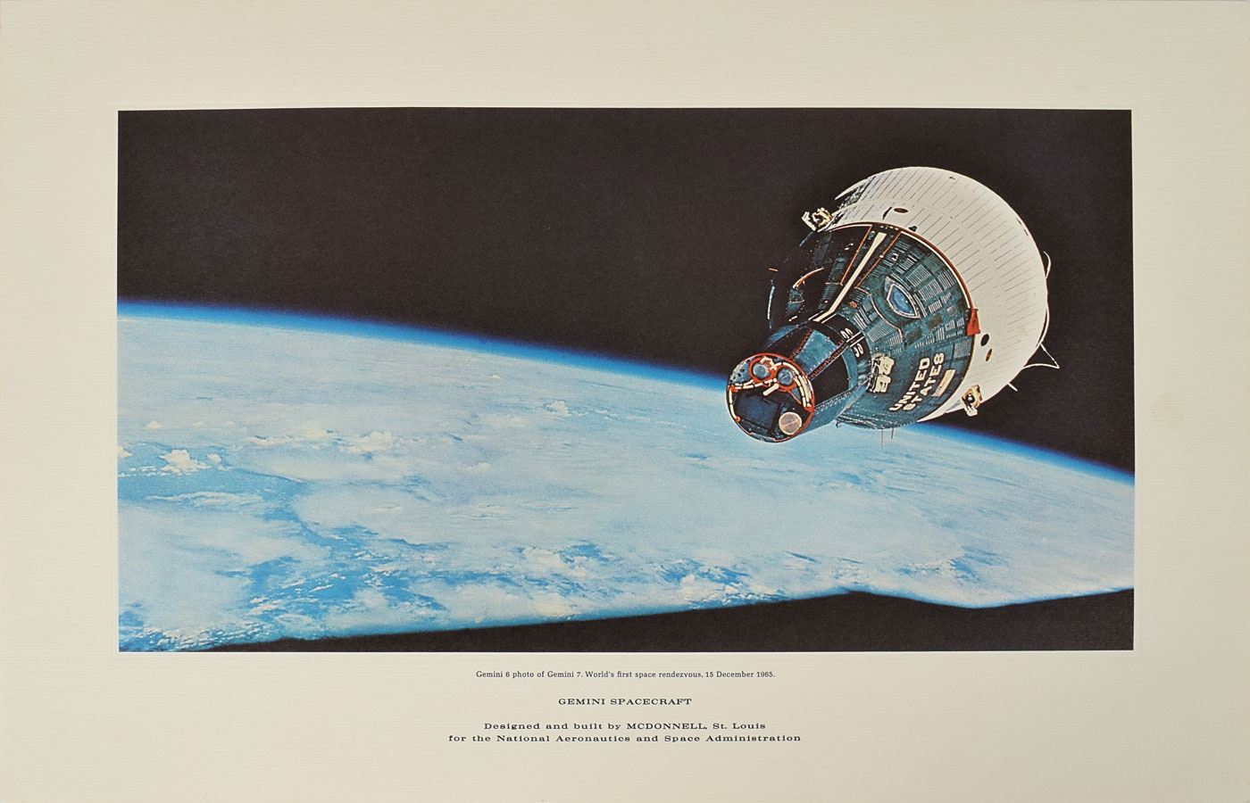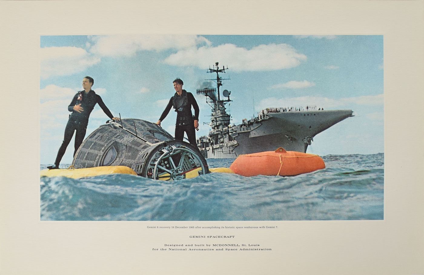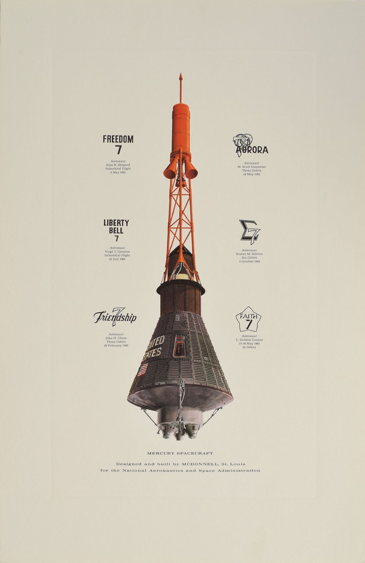 Set of seven high-quality color lithographs, 11 x 17 and 17 x 11, depicting projects completed by McDonnell, with subjects including: the Mercury Spacecraft, the Gemini Spacecraft (3), the Thor-Delta rocket, the Douglas DC-9 plane, and the Dragon Medium Assault Weapon. In overall very fine condition. Accompanied by the original mailing envelope.