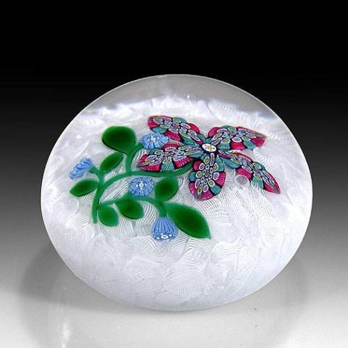 P. McD Glass Studio millefiori flower and buds on lace paperweight. The piece contains a large flower, with a star cane center and five pink and green complex cane petals, which grows on a stem, with four blue complex millefiori buds and green leaves, on white upset muslin. Made by Peter McDougall, "PMcD" signature cane on the base. Diameter 2 7/8".
