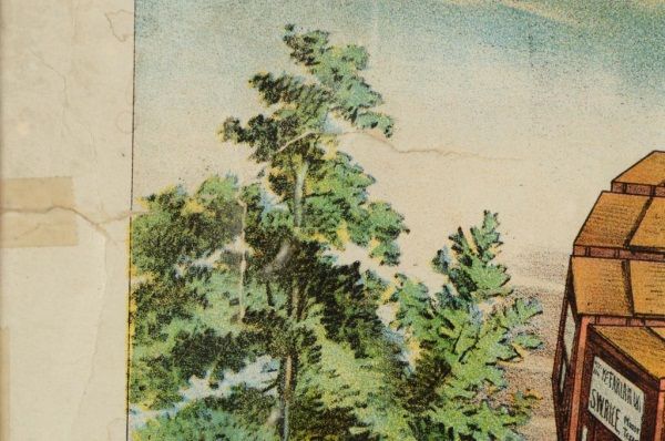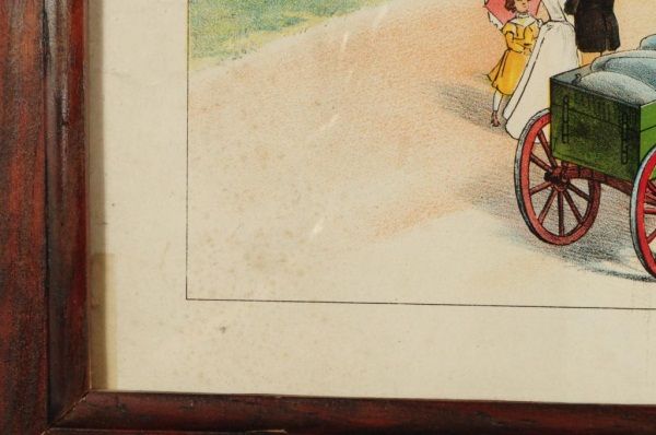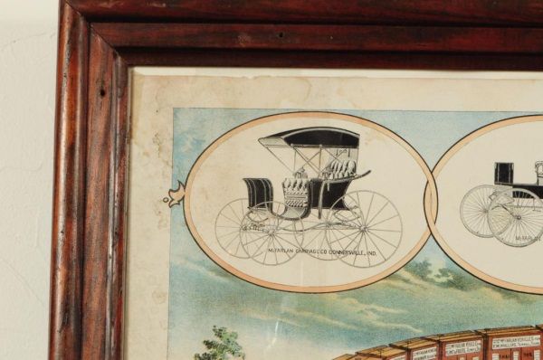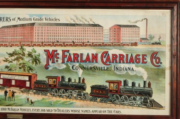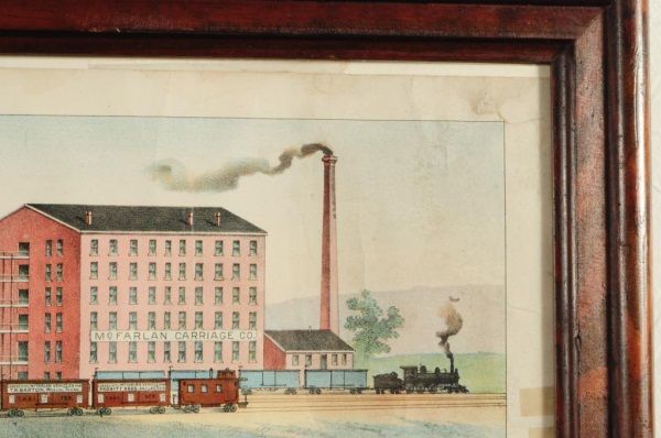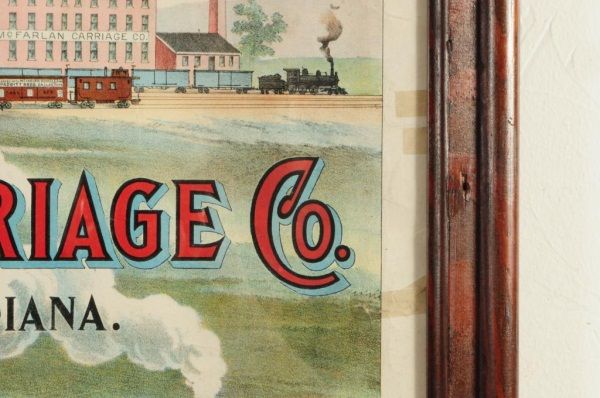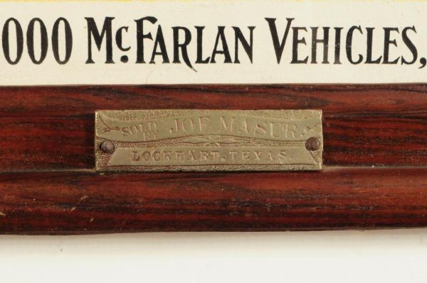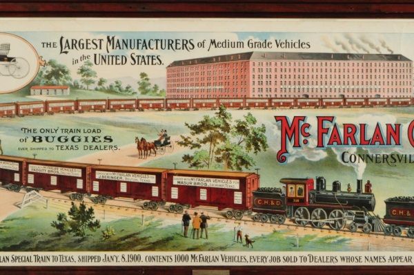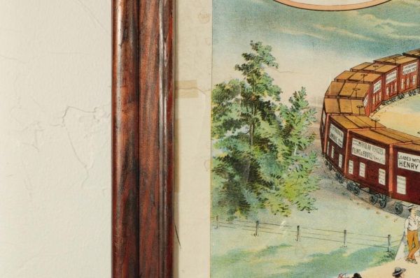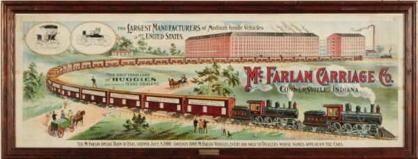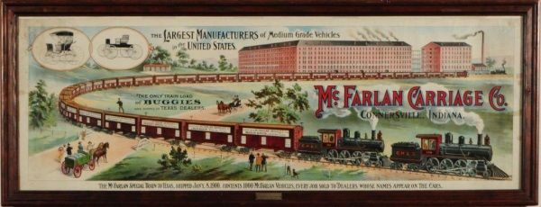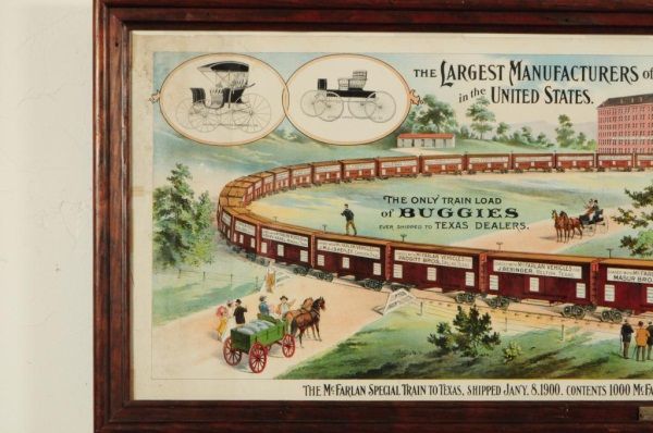 RARE "The McFarlan Special Train to Texas, Shipped Jan'y 8, 1900. Contents 1000 McFarlan Vehicles, Every Job Sold to Dealers Whose Names Appear on the Cars." "The Only Train Load of Buggies Ever Shipped to Texas Dealers". Texas Cities listed on cars include: Moody, Temple, Marshall, Dallas, Belton, Lockhart, Terrell, New Braunfels, Hillsboro, Howe, Lampasas, Orange, Wills Point, Texarkana, Mexia, Clarksville, Palestine, San Marcos, Tyler, Dennison, Marlin. Frame has plaque: "Sold by Joe Masur, Lockhart, Texas". Image measures 17-1/2" x 51".