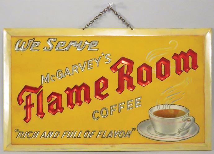 McGarvey's Flame Room Celluloid Over Cardboard Chain Hanging/Easelback Sign. Very good condition. 15 X 9 inches.