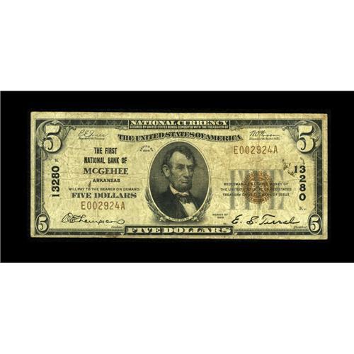 <B>McGehee, AR</B></I> - $5 1929 Ty. 1 <B>The First NB</B></I> Ch. # 13280<BR>This was McGehee's only bank, with fives the sole denomination issued. Just four large and seven small notes make up the entire census, with offerings few and far between. <B>About Fine.</B></I><BR><BR><b>Shipping:</b> Coin/Currency (<a target="_blank" href="http://www.heritageauctions.com/common/shipping.php">view shipping information</a>)