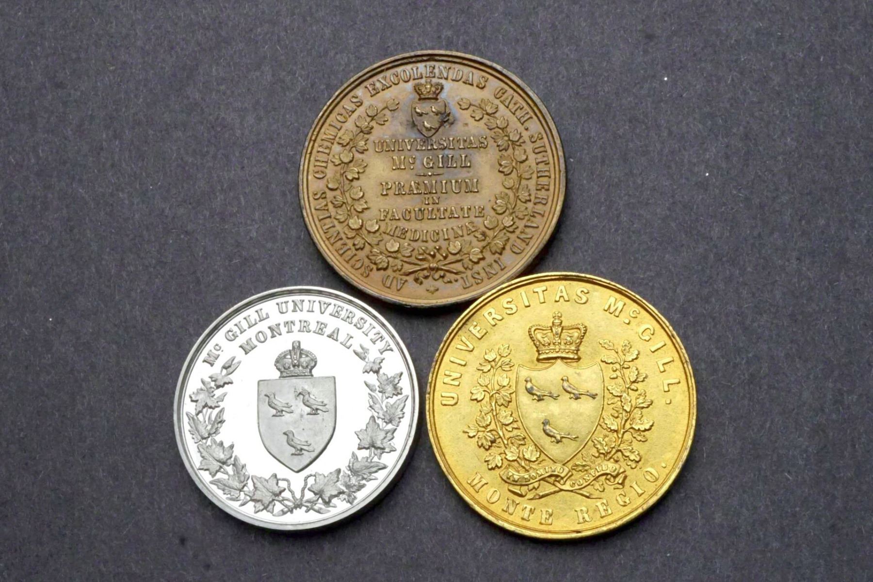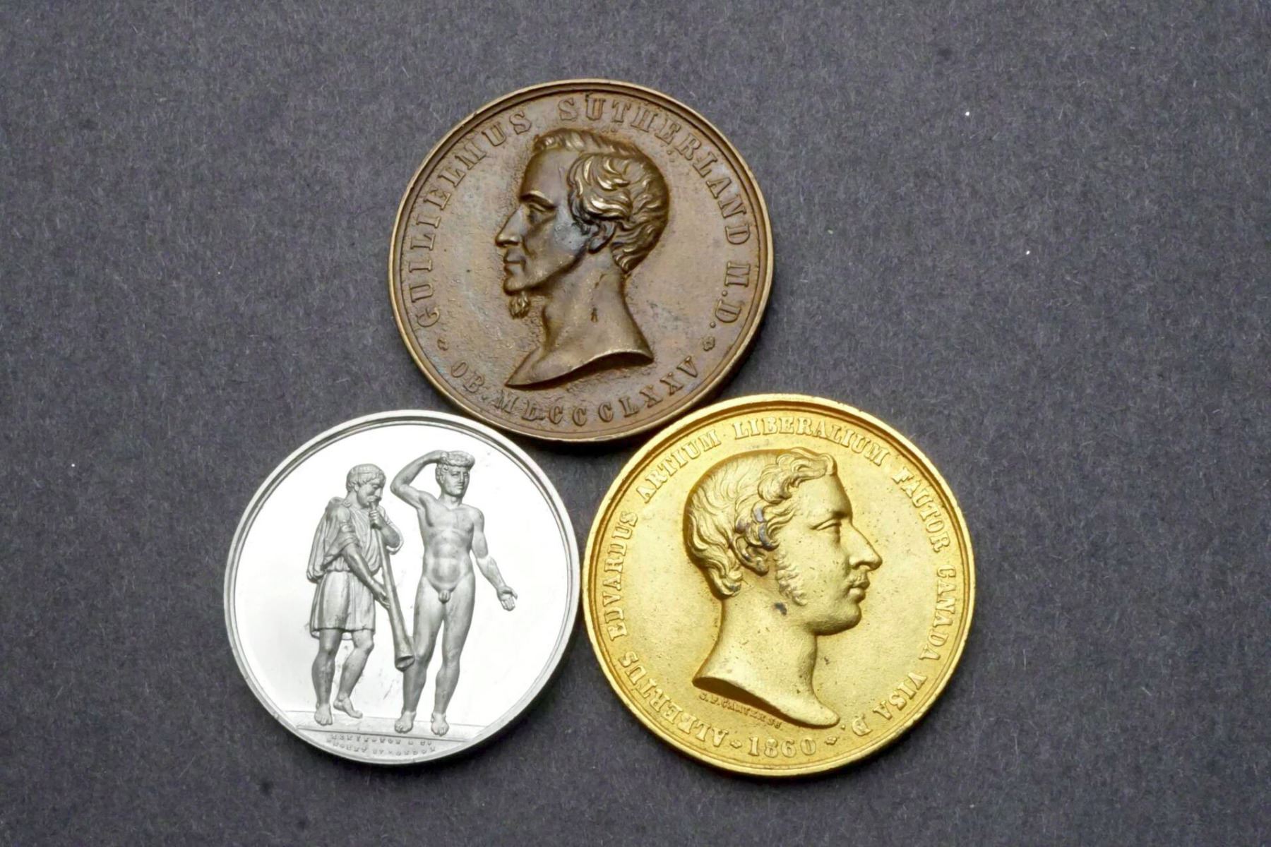 1) Bright Aluminum, 38 mm, 22.3 grams obverse: two young men standing, the one at left in classical dress, blowing a long horn, the one at right nude, holding a wreath over his head. In exergue: ELKINGTON & CO. / REGENT ST. LONDON. The reverse McGILL UNIVERSITY / Montréal at top. At center, a wreath with the University crowned crest at center. 2) 40 mm, 21.6 grams, gilt, probably on white metal. ALBERTUS EDVARDUS ARTIUM LIBERALIUM FAUTOR CANADA VISA D. 1860. Bust of the Prince of Wales, right. Signed below: S. F. CARTER SC. Reverse: UNIVERSITAS McGILL MONTE REGIO Crowned shield in wreath. 3) 42 mm, 23.7 grams. Seems to be bronze plated white metal. GUILMIELMUS SUTHERLAND M. D. OB. MDCCCLXXV. Bust, left. Reverse: AD SCIENTIAS CHEMICAS EXCOLENDAS CATH. SUTHERLAND INST. In wreath with crowned crest on top, UNIVERSITAS McGILL - PRAEMIUM IN FACULTATE MEDICINAE.