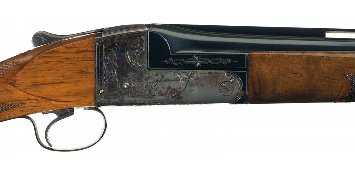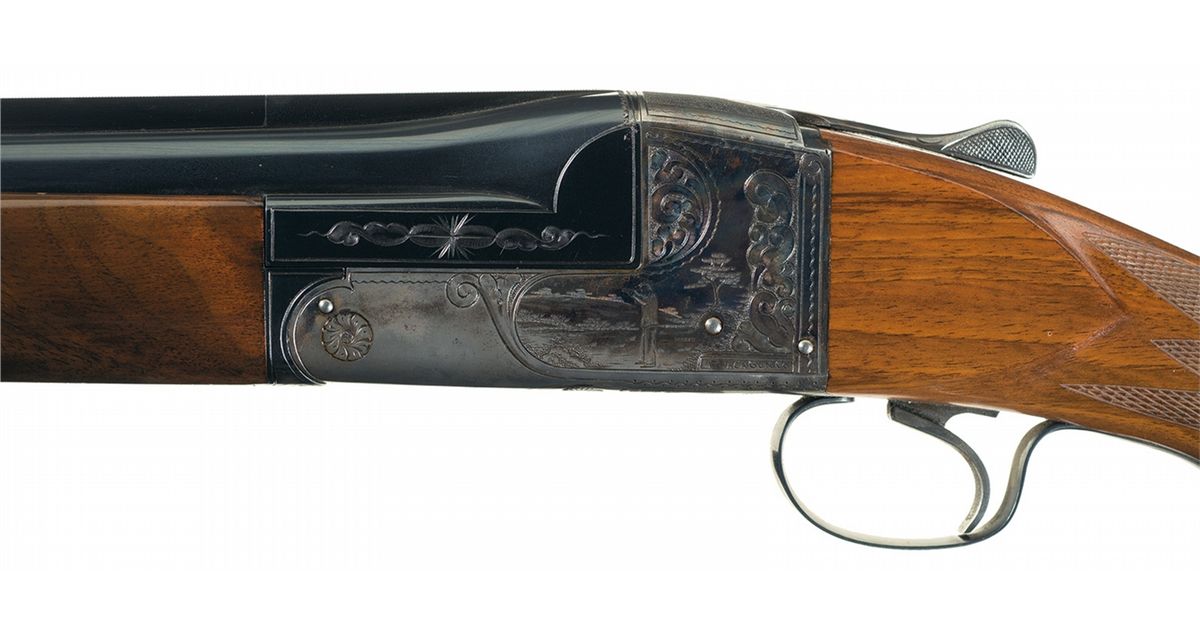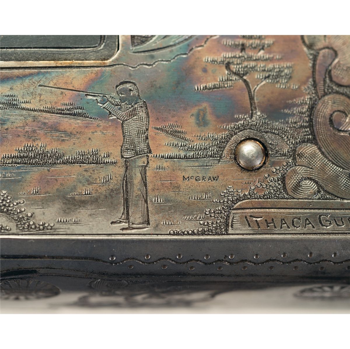 This example was manufactured in 1959. The left side of the receiver is engraved with a man ready to fire his shotgun in a field scene which is signed "McGRAW". The right side of the receiver is engraved with an Indian drawing a bow back in a field scene. There are flourishes of floral scroll engraving on both sides of the receiver, on the underside of the receiver, on the trigger plate, on the trigger guard and on the sides of the breech end of the barrel. The barrel is choked .032 and has a 2 3/4 inch chamber with ejector. Mounted on the original multi-point checkered semi-beavertail walnut forearm and a custom pistol grip stock with contrasting grip cap, raised cheekpiece, comb and Jenkins recoil pad. Length of pull is 14 1/4 inches with a spacer installed. Comes with the original stock numbered to the gun having a Pachmayr recoil pad and an extra Ithaca "sunburst" recoil pad with aluminum backing plate.