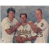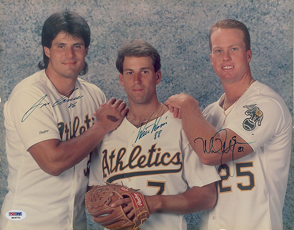 Color glossy 14 x 11 photo of the Oakland A’s teammates, signed in blue felt tip by Jose Canseco, Walt Weiss, and Mark McGwire. In fine condition, with a PSA/DNA authentication label affixed to lower left corner. Accompanied by a certificate of authenticity from PSA/DNA.
