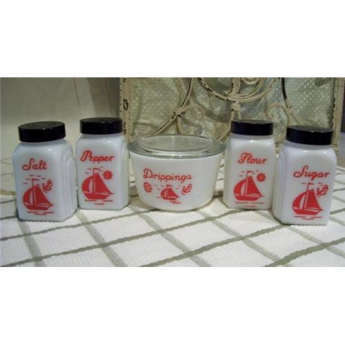 Nice set of McKee range shakers in the Roman Arch shape with the drippings bowl. This pattern is from the 1930's. The set includes; Flour, Sugar, Salt, and Pepper shakers, and the 8 ounce dripping bowl with clear glass lid. The shakers have their original black bakelite lids. These have the "P" and "S" holes on the tops. They only made P's and S's, so the flour shaker has a P. All the glass is chip and crack free. The red fired on lettering extremely good, with just a few tiny specs missing, (see pictures). Nice to find a set together.
