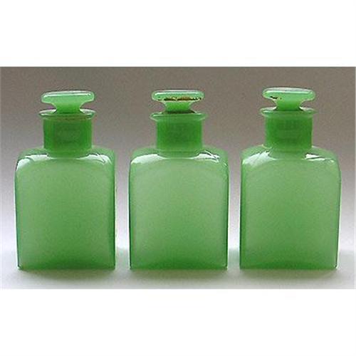 Produced during the 1920-1930s by, it is believed, McKee this Art Deco set of three (3) Jadite lotion bottles still has the remnants of gold trim. They each Measure 4 1/2 inches tall x 2 1/2 inches across and with the exception of a scratch or two they are in excellent condition without chips, or cracks.