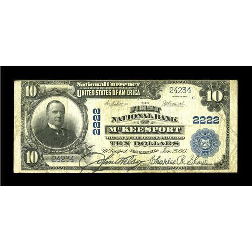 <B>McKeesport, PA</B></I> - $10 1902 Plain Back Fr. 631 <B>The First NB</B></I> Ch. # 2222<BR>This bank is always popular due to its solid "2" charter number. The signatures are boldly stamped on this $10. <B>Fine.</B></I><BR><BR><b>Shipping:</b> Coins & Currency (<a target="_blank" href="http://www.heritageauctions.com/common/shipping.php">view shipping information</a>)