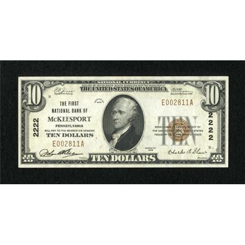 <B>McKeesport, PA</B></I> - $10 1929 Ty. 1 <B>The First NB</B></I> Ch. # 2222<BR> A very popular bank because of its solid charter number, this note is a nice <B>About Uncirculated</B></I> with just a hint of a fold and plenty of original embossing. A small pencil notation in the back left margin has to be mentioned for the sake of accuracy.<BR><I>From The Kansas City Collection</B></I><BR><BR><b>Shipping:</b> Coins & Currency (<a target="_blank" href="http://www.heritageauctions.com/common/shipping.php">view shipping information</a>)