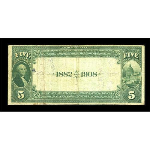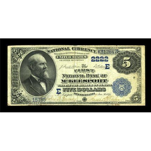 <B>McKeesport, PA</B></I> - $5 1882 Date Back Fr. 534 <B>The First NB</B></I> Ch. # (E)2222<BR> This $5 Second Charter Date Back is the only example of its type and denomination listed in the census from this bank. <B>About Fine,</B></I> bright for the grade and problem free as well. <BR><BR><b>Shipping:</b> Coins & Currency (<a target="_blank" href="http://www.heritageauctions.com/common/shipping.php">view shipping information</a>)