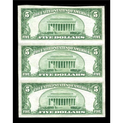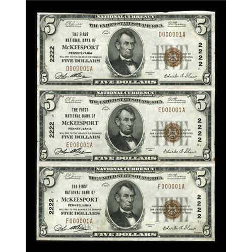 <B>McKeesport, PA</B></I> - $5 1929 Ty. 1 <B>The First NB</B></I> Ch. # 2222 Uncut Strip of Three<BR> An uncut strip of three serial number 1 examples. Each note grades <B>About Uncirculated,</B></I> with a couple of flyspecks evident at the margins of each piece. Since no full uncut sheets are known from here, this strip of three will have to suffice. <BR><BR><b>Shipping:</b> Coins & Currency (<a target="_blank" href="http://www.heritageauctions.com/common/shipping.php">view shipping information</a>)