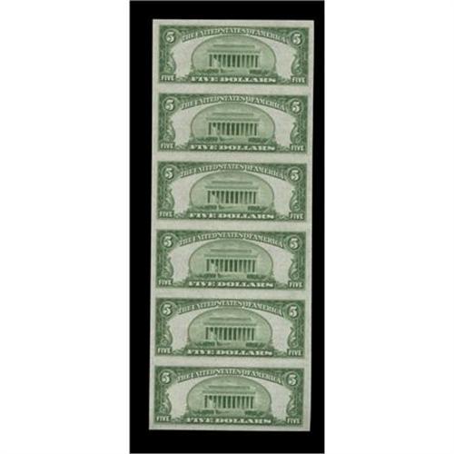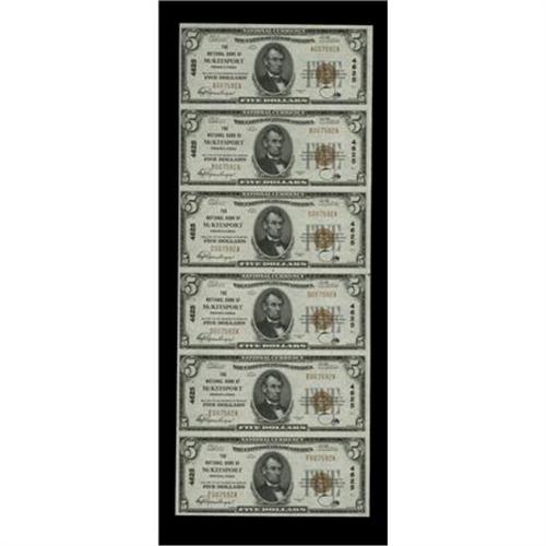 <B>McKeesport, PA</B></I> - $5 1929 Ty. 1 <B>The NB of McKeesport</B></I> Ch. # 4625 Uncut Sheet of Six<BR>A dark brown overprint is found on these $5s. The president for this sheet is J.W. Albig. <B>Very Choice Crisp Uncirculated.</B></I><BR><I>From The Plymouth Rock Collection</B></I>