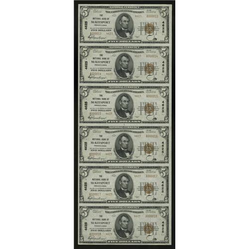 <B>McKeesport, PA</B></I> - $5 1929 Ty. 2 <B>The NB of McKeesport</B></I> Ch. # 4625 Uncut Sheet<BR>This is the third sheet for this type and denomination on this bank. The upper and lower right corners have folds that cross into the design. Still a nice <B>Choice Crisp Uncirculated</B></I> sheet.<BR><BR><b>Shipping:</b> Coin/Currency (<a target="_blank" href="http://www.heritageauctions.com/common/shipping.php">view shipping information</a>)