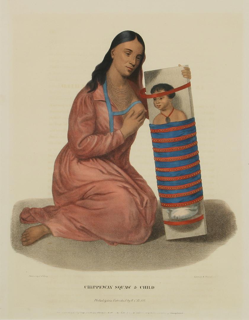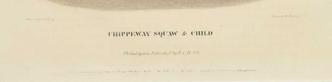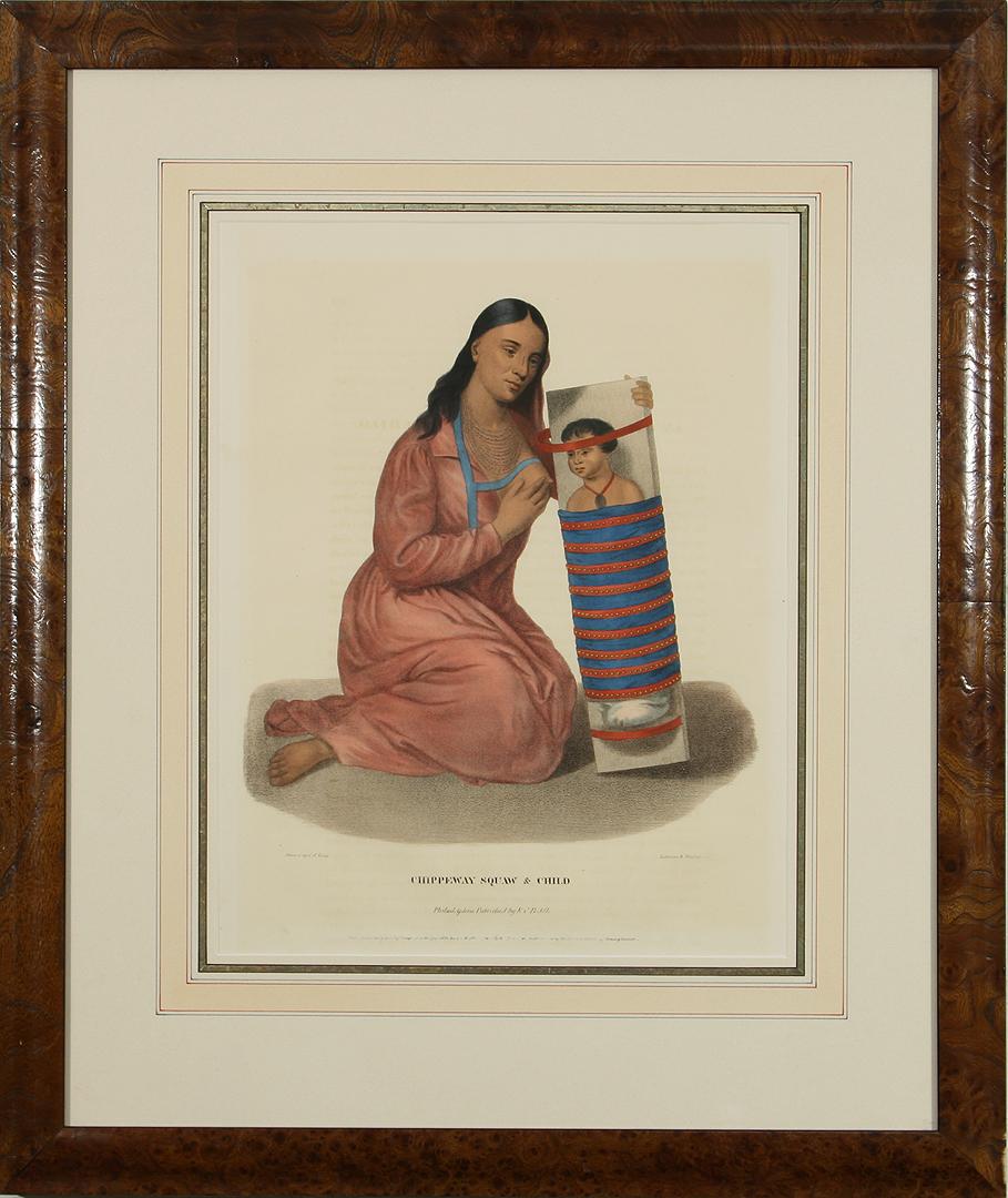 McKenney & Hall Hand Colored Lithograph, Published by E.C. Biddle in 1834. "Chippeway Squaw and Child", copied by Charles Bird King (1985-1862) from the original by James Otto Lewis (1799-1858), sight size 16 1/4" x 13 3/4"