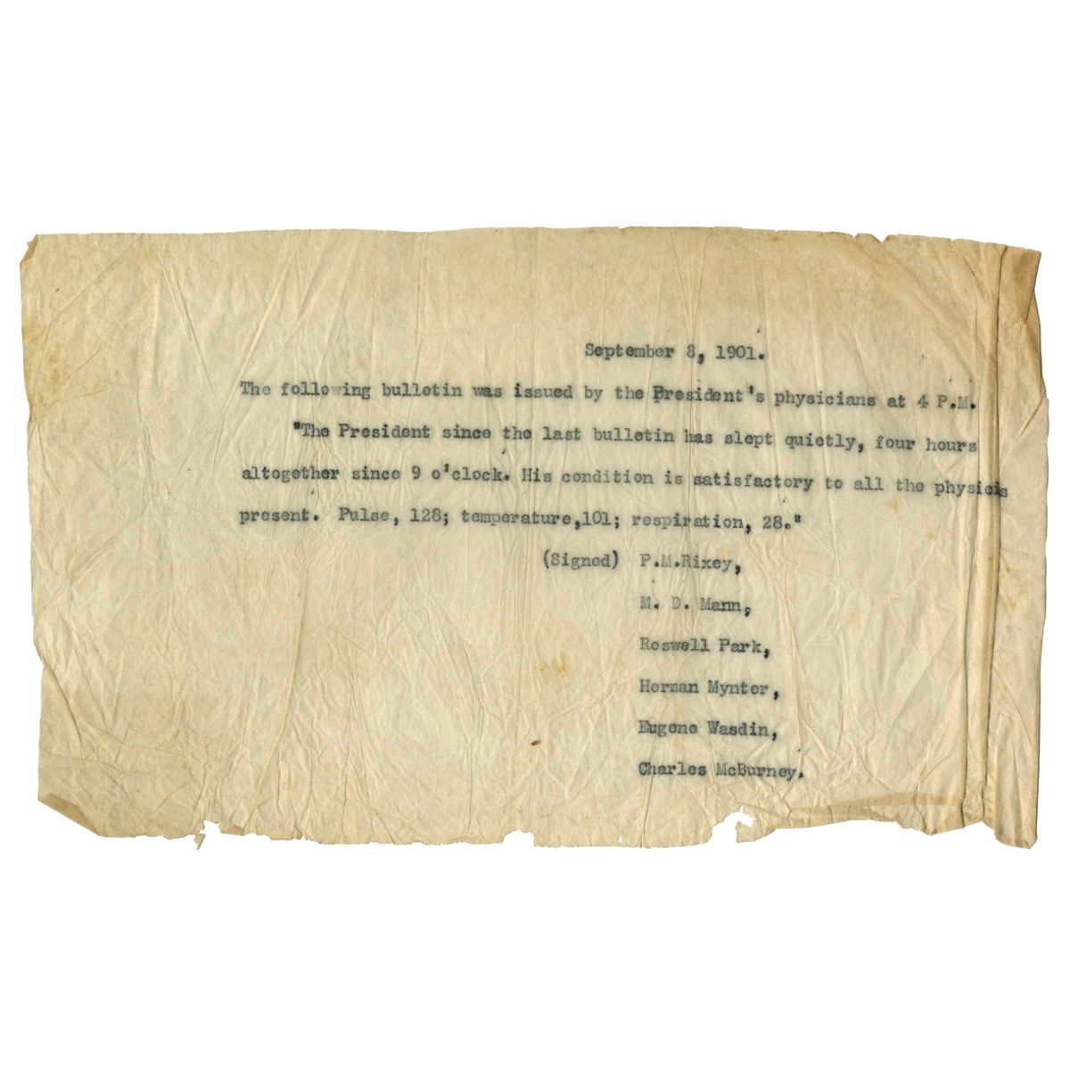 This bulletin, issued 8 September 1901, was released by McKinley's physicians after the assassination attempt on 6 September 1901. He appeared to be recovering from his wounds, but then died six days later. The typed carbon copy reads in part: ''…His condition is satisfactory to all the physicians present. Pulse, 128; temperature, 101; respiration, 28…'' 8'' x 4.75'' telegram has paper loss on edges and moderate wrinkling not affecting text. Overall very good condition.