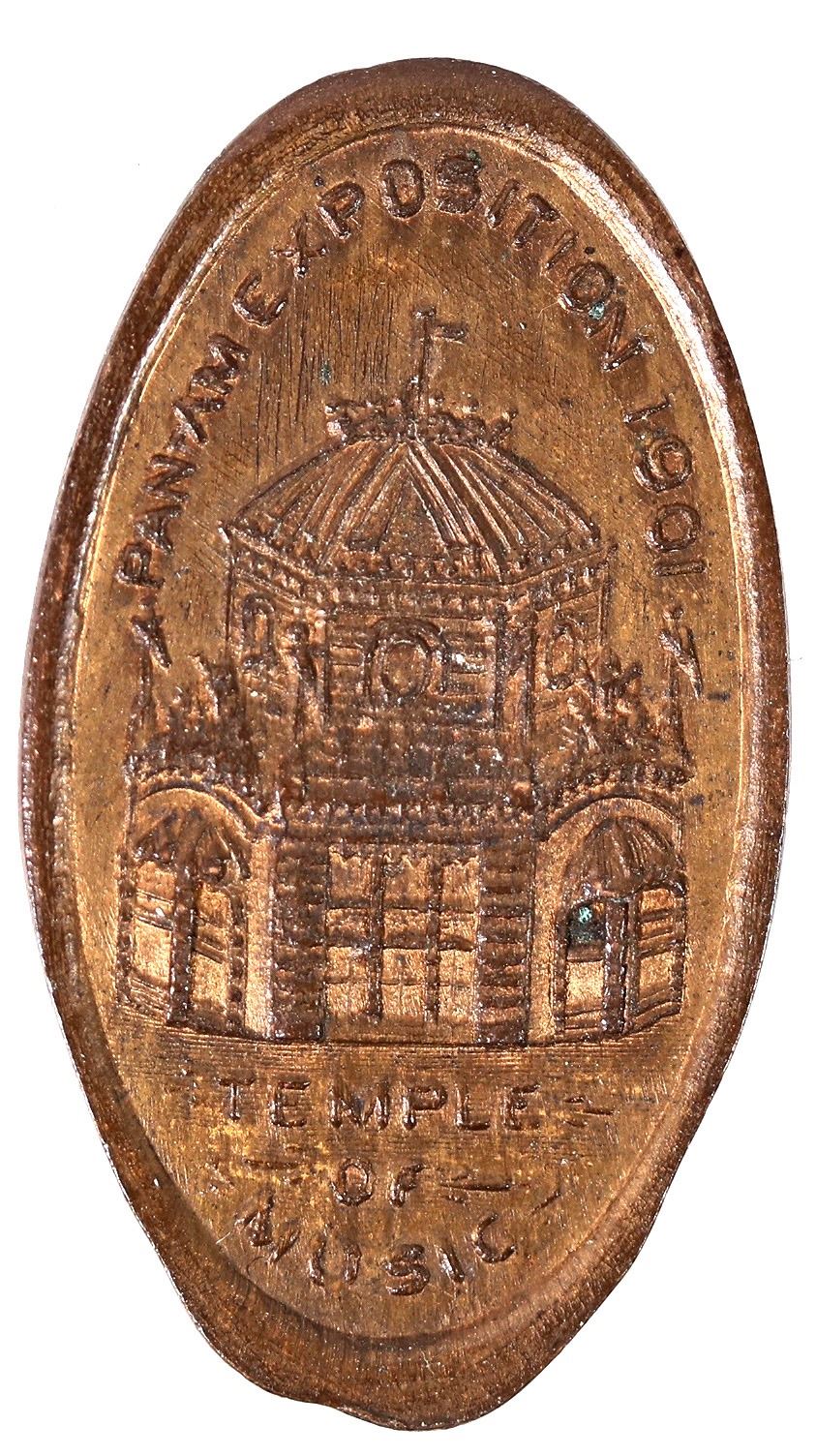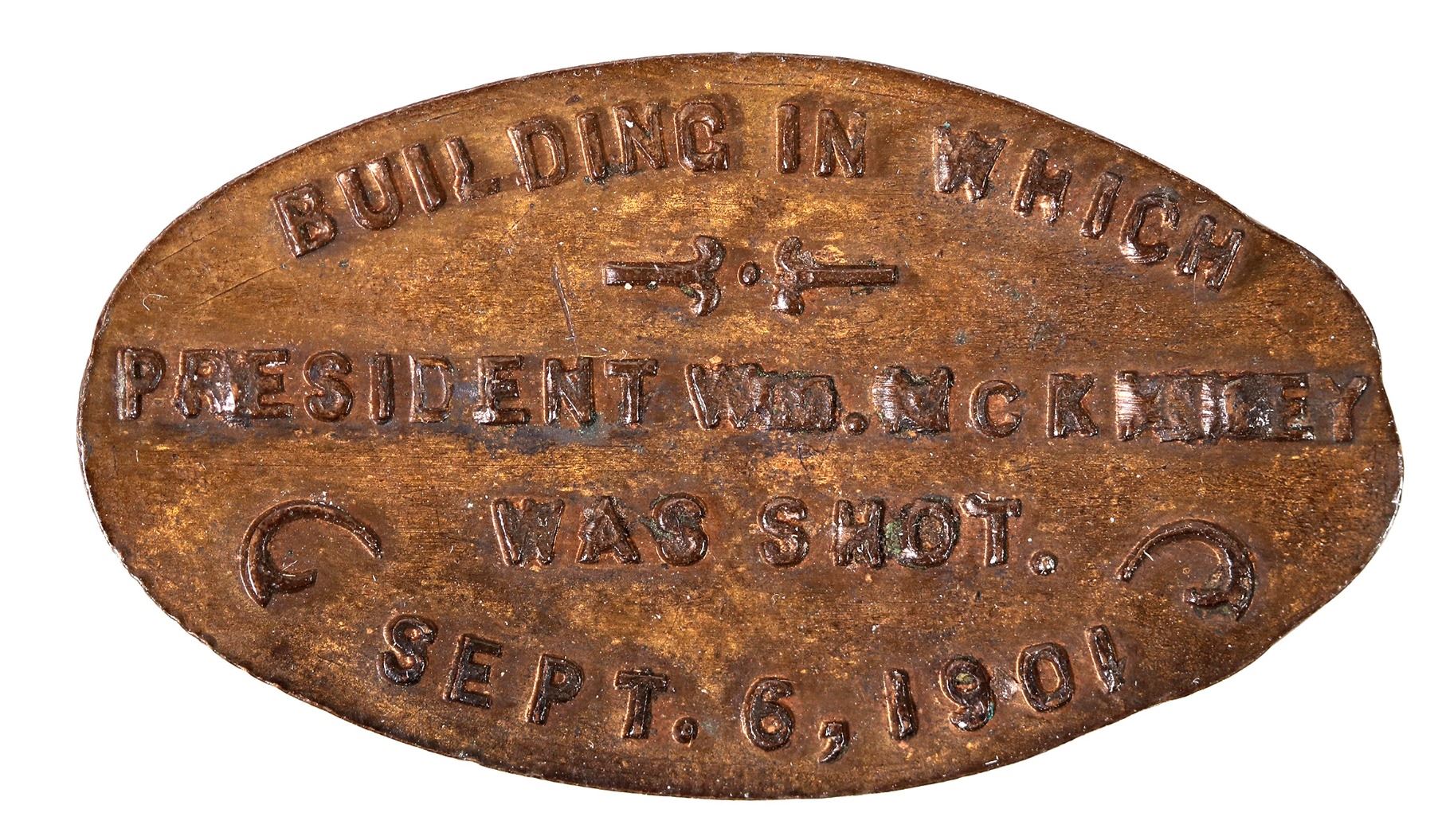September 6, 1901, while visiting the Pan Pacific Exposition in Buffalo, New York, President William McKinley was shot. This elongated cent has the Temple of Music on one side and on the other: Building In Which / President Wm. McKinley / Was Shot / Sept. 6, 1901.