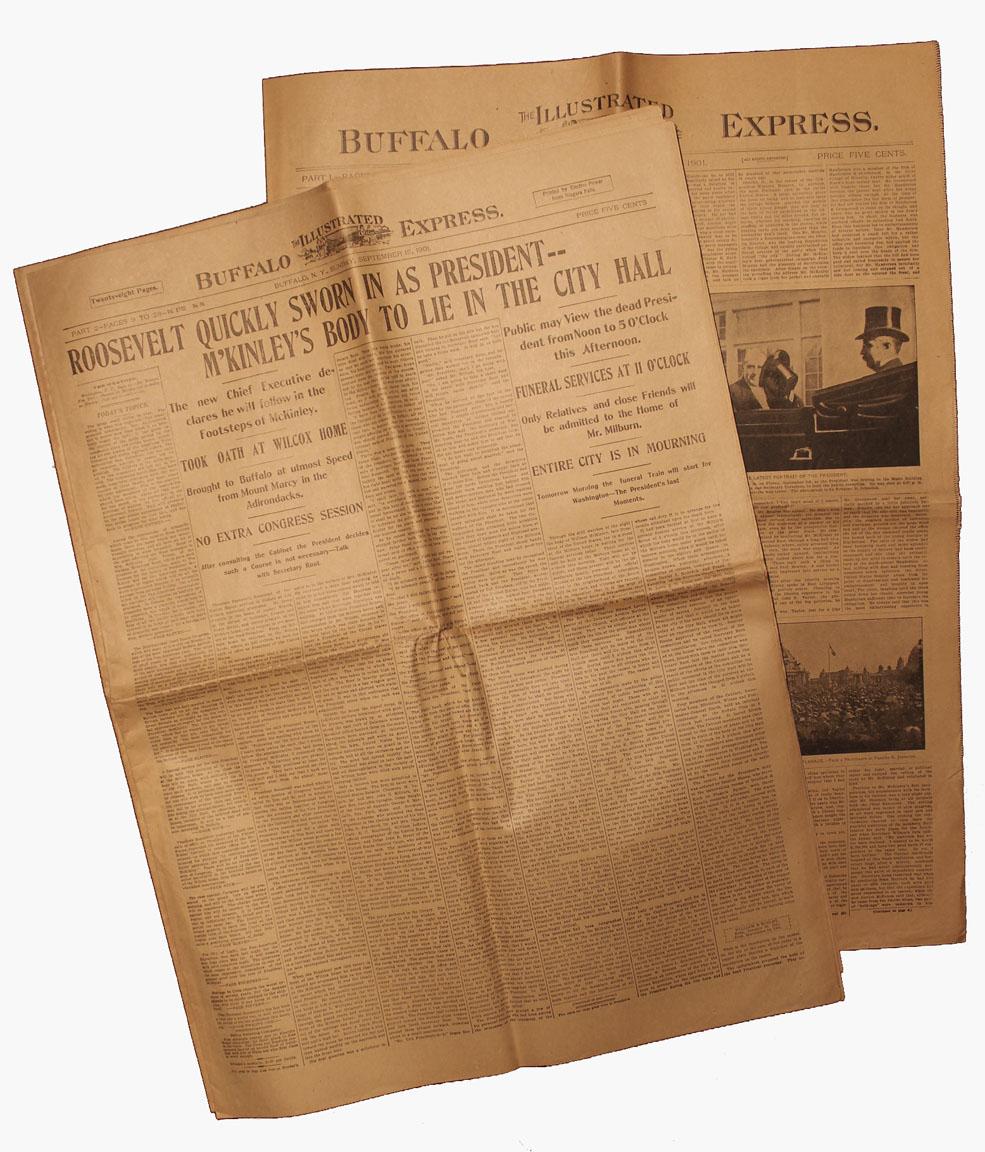 Very rare ''Buffalo Illustrated Express'' newspaper dated 15 September 1901 reporting upon the assassination of President William McKinley in Buffalo, and showing the last purported photograph of him, taken 17 minutes before he was shot. Complete 28 page paper contrasts McKinley's jovial character with that of another assassinated President, Abraham Lincoln, and also reports on McKinley's funeral and Roosevelt's swearing-in, who was ''Brought to Buffalo at utmost Speed...'' Newspaper is in very good plus condition with minimal chipping.